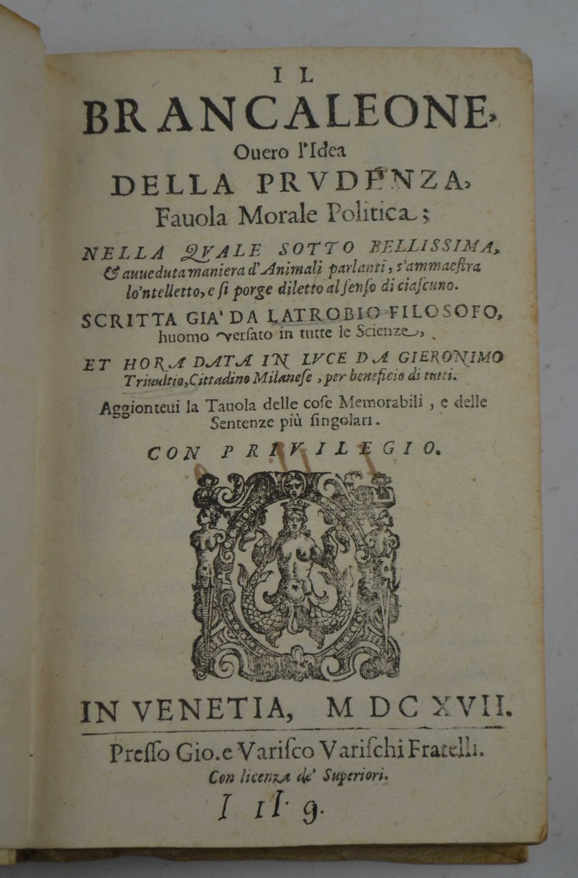 Il Brancaleone Overo l'Idea della prudenza, Favola Morale Politica; nella quale sotto bellissima, et avveduta maniera d'Animali parlanti, s'ammaestra lo 'ntelletto, e di porge diletto al senso di ciascuno… hora data in luce da Gieronimo Trivultio, Cittadino Milanese, per beneficio di tutti.