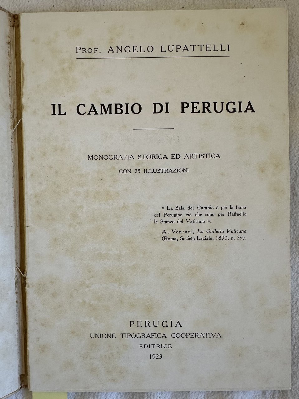 Edizione del 1923 di questa monografia storica ed artistica del "Cambio di Perugia" a cura di Angelo Lupatteli. All'interno alcune foto e illustrazioni. In buone condizioni. Copertina editoriale in buone condizioni generali con lievi usure ai margini e dorso. Legatura in discrete condizioni con qualche lieve rottura. Pagine in buone condizioni con fioriture. In 16. cm 17x12,5. Pp. 55.Edition of 1923 of this historical and artistic monography of "Cambio di Perugia" by Angelo Lupatteli. Some photoes and illustrations. In good conditions. Editorial cover in good conditions lightly worn in the extremities. Binding in good conditions. Pages in good conditions with foxing. In 16. cm 17x12,5. Pp. 55.