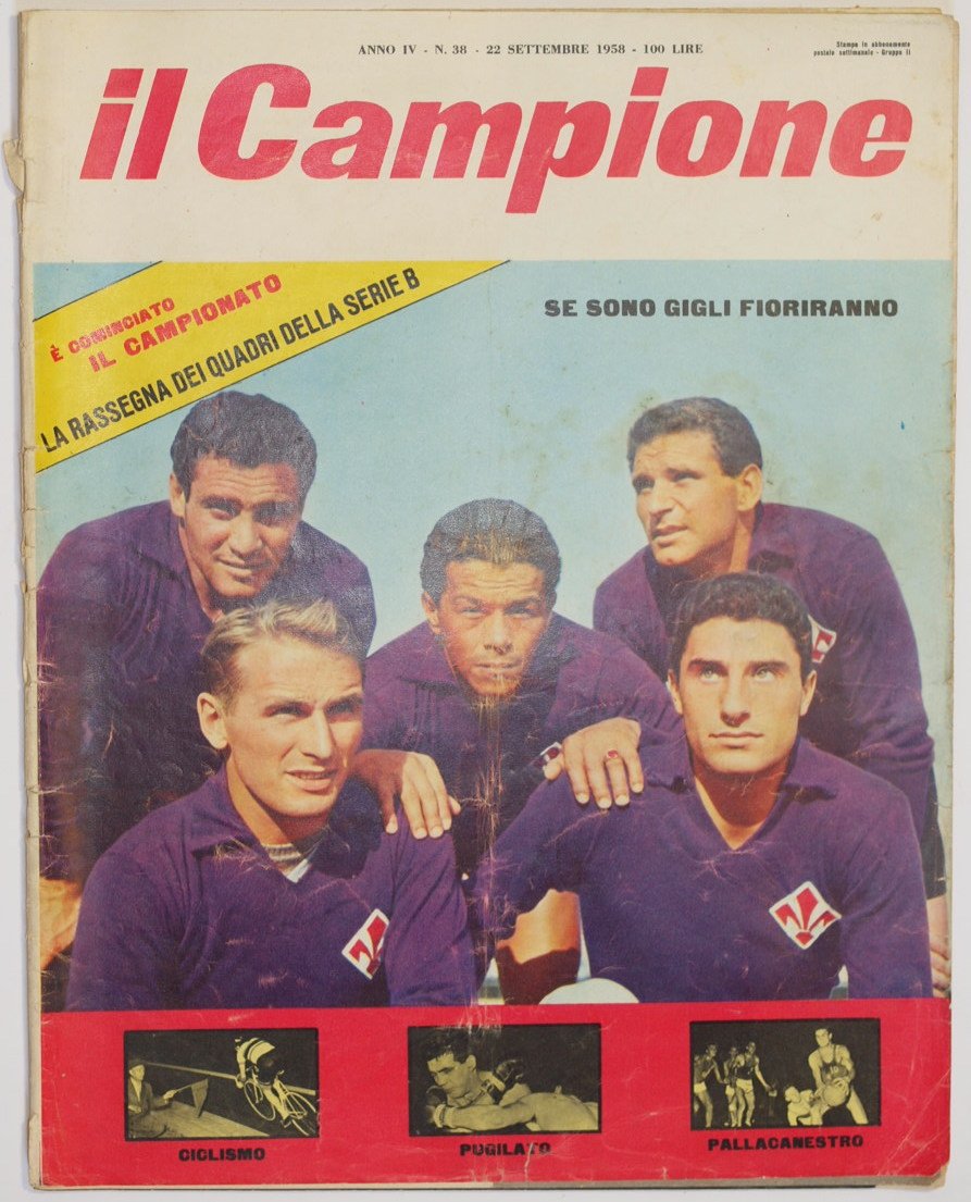 In folio. Dim. 33x26 cm. Pp. 51. Numero del 22 settembre 1958 di questa famosa rivista di sport "Il campione". Tra gli articoli all'interno: Loi pugilato, Merano, Calcio spagnolo, campionato di calcio con un articolo epr partita (udinese inter, Genova Napoli, Spal Juventus, LAzio Sampdoria, Fiorentina Lanerossi, Padova Roma, Bari Bologna, Torino Alessandria, Milan Triestina), Jacques Anquetil, Defilippis e la Carpano, Juventus, Piero Rava ecc. Numerose foto d'epoca all'interno. Brossura editoriale originale. In buone condizioni. Brossura editoriale in discrete condizioni generali con usure ai margini e dorso. Piatti staccati. Legatura in buone condizioni. Pagine in buone condizioni con rare fioriture. Number of the 22nd of september 1958 of this famous magazine of sport "Il campione". Betweent the articles inside: Loi pugilato, Merano, spanish soccer, soccer championship with an article for each competition (udinese inter, Genova Napoli, Spal Juventus, LAzio Sampdoria, Fiorentina Lanerossi, Padova Roma, Bari Bologna, Torino Alessandria, Milan Triestina), Jacques Anquetil, Defilippis e la Carpano, Juventus, Piero Rava etc. Different photoes inside. Original editorial cover. In good conditions. Editorial cover in fair general conditions with wearings in the edges and spine. Plates are detached. Binding in good conditions. Pages are in good conditions with occasional foxings.