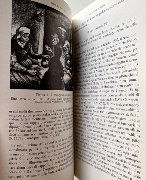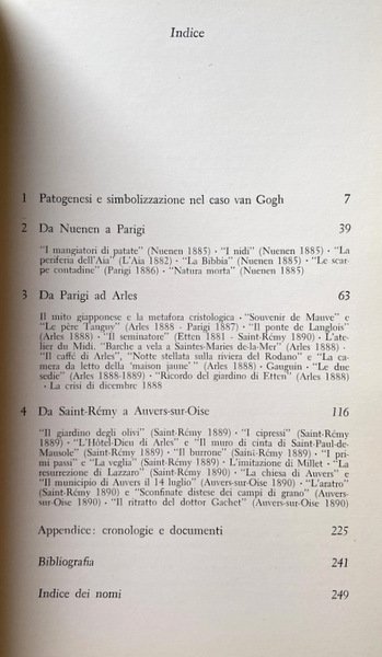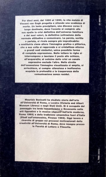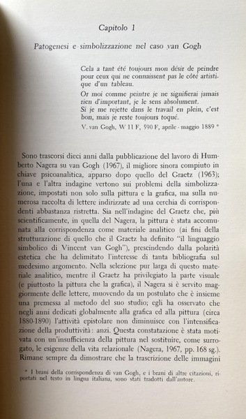 Soggetti: Storia dell'arte, Teoria, Critica, Biografie, Pittura, Pittori, Storia dell'arte per temi e concetti, Discipline artistiche, Analisi, Lettura, Interpretazione, Arte fiamminga e olandese, Follia, Psicologia, Psichiatria, Psicopatologia, Disturbi mentali, malattia mentale, Pazzia, Dipinti, Disegni, Acquerelli, Schizzi, Ritratti, Studi culturali, Neunen, Parigi, La periferia dell'Aja, Mangiatori di patate, Natura morta, Bibbia, Arles, Souvenir de Mauve, Le père Tanguy, Notte stellata sulla riviera del Rodano, Il seminatore, Metafora cristologica, Mito giapponese, L'atelier du midi, I nidi, La camera da letto della maison jaune, Le due sedie, Saint-Rémy, Auvers-sur-Oise, Cipressi, La veglia, L'imitazione di Millet, La resurrezione di Lazzaro, Il municipio di Auvers, Sconfinate distese di campi di grano, Dottor Gachet, L'aratro, Il burrone, La veglia, I primi passi, Documenti, Bibliografia, Libri illustrati, Libri Vintage Fuori catalogo, van Donk-Kooiman, Criminologia clinica, Lettere, Corrispondenza, Theo, Roberto Calasso, Getsemani, Correspondance, Litografie, Lewin, Vita relazionale, Freud, Die Verdichtungen, Simbolismo, Simboli, Linguaggio pittorico, Trauma, Famiglia, Ludwig Binswanger, Tradimento, Giuda, Getsemani, Olivi, Johanna Bonger, Cristo, Gauguin, Bernard, Studi di mani, Olanda, Paesi Bassi, Ottocento, Girasoli, Realismo, Barbizon, Jean-François Millet, Anversa, La ville lumière, Provenza, Giapponismo, Fiori, Paul Signac, Terrazza del caffè la sera, Casa gialla, Colori, Mutilazione dell'orecchio, Delacroix, Courbet, La camera di Vincent, Epilessia, Schizofrenia, Disturbo bipolare, Sifilide, Albert Aurier, Incisioni, Impressionismo, Impressionisti francesi, La cortigiana, La fioritura, L'italiana, Octave Mirbeau, Willem de Kooning, Howard Hodgkin, Jackson Pollock, Brama di vivere, Walther, Metzger, Crispino, XIX secolo, Appunti, Internamento, Fratello, Casa di cura, History of art, Theory, Criticism, Biographies, Painting, Painters, History of art by themes and concepts, Art disciplines, Analysis, Reading, Interpretation, Flemish and Dutch art, Madness, Psychology, Psychiatry, Psychopathology, Mental disorders, illness Mental, Madness, Paintings, Drawings, Watercolors, Sketches, Portraits, Cultural studies, Paris, The Hague suburbs, Potato eaters, Still life, Bible, Starry night on the rhone riviera, The sower, Christological metaphor, Myth Japanese, The nests, The bedroom, The two chairs, Cypresses, The vigil, The imitation of Millet, The resurrection of Lazarus, The Town hall, Boundless expanses of wheat fields, The plow, The ravine, The vigil, First steps, Documents, Bibliography, Picture books, Out of print books, Clinical criminology, Letters, Correspondence, Gethsemane, Correspondance, Lithographs, Relational life, Symbolism, Symbols, Pictorial language, Family, Betrayal, Judas, Gethsemane, Olives, Christ, Hands studies, Holland, Netherlands, Nineteenth century, Sunflowers, Realism, Antwerp, Provence, Japonism, Flowers, Coffee terrace in the evening, Yellow house, Colors, Ear mutilation, The room, Epilepsy, Schizophrenia, Bipolar disorder, Syphilis, Engravings, Impressionism, French impressionists, The courtesan, Flowering, The Italian, Lust for life, 19th century, Notes, Internment, Brother, Nursing home, Suicidio