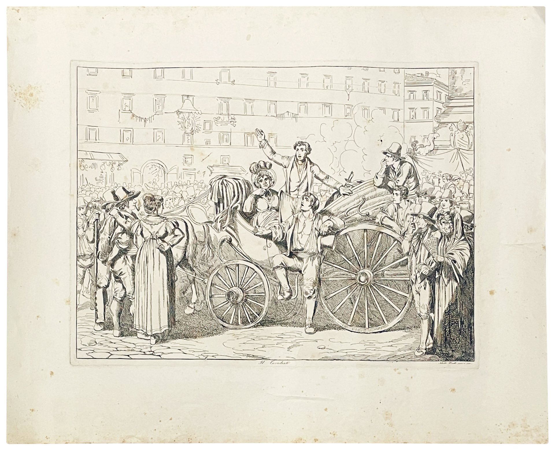 The print, drawn and engraved by Achille Pinelli, shows the arrival of the Cavadenti (the Tooth Puller) on a carriage in Piazza Montecitorio, Rome, awaited by a large crowd. The front scene is very detailed, while the background of the scene is only sketched. The print is very interesting for its particular artistic style, as well as a testimony of the Roman life in the first half of the 19th century.