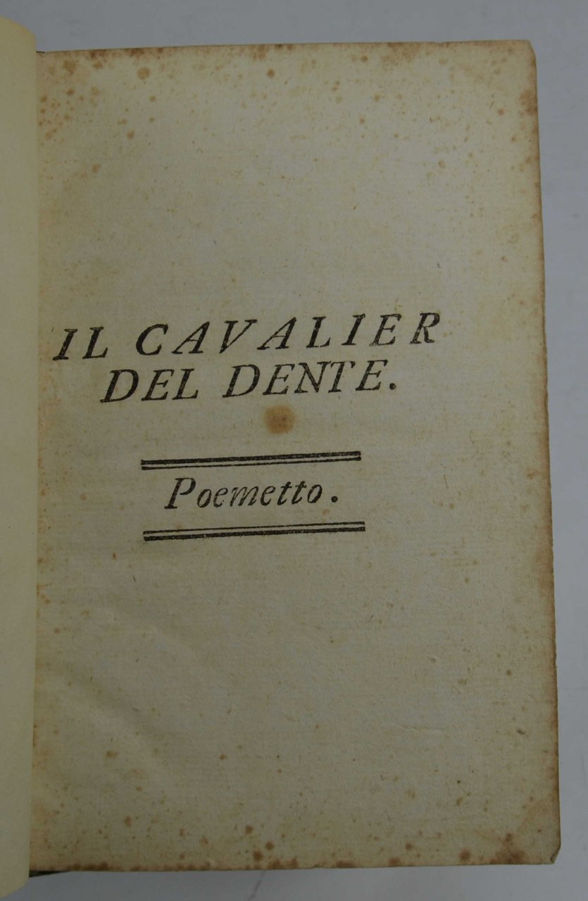 Cm. 18, pp. 47 (1). Capilettera e testatine decorate. Leg. recente in cartoncino rigido ricoperto da carta decorata. qualche lievissima fioritura, peraltro esemplare in ottimo stato di conservazione. Curioso poemetto satirico di carattere gastronomico.