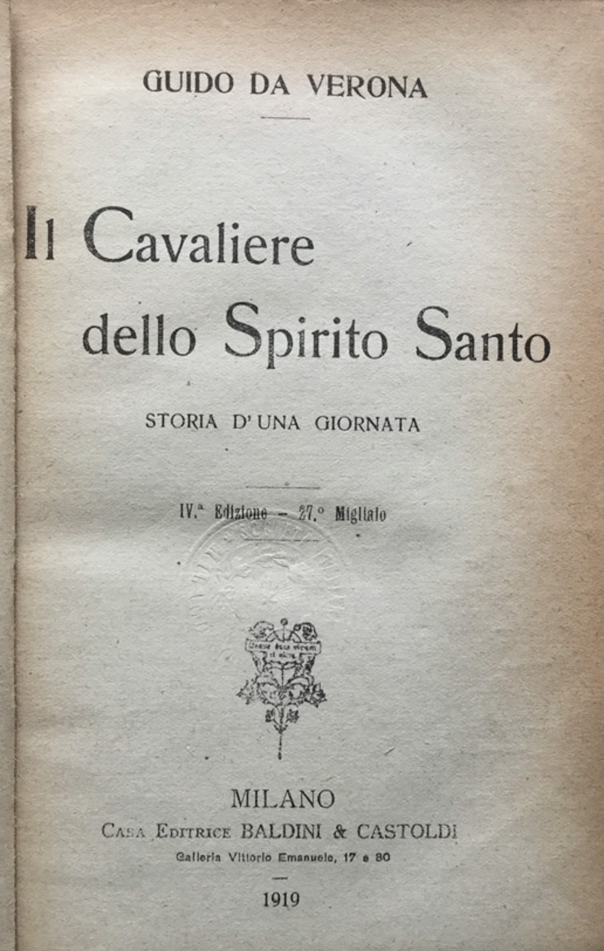 Il Cavaliere dello Spirito Santo. Storia d'una giornata. 4a ediz. 27^ migl.