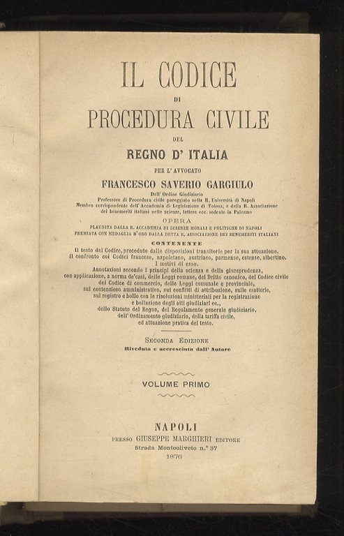 Napoli, presso Giuseppe Marghieri, 1876, un volume (su 4) in-8, legatura coeva in mezza tela, pp. 745. Modesto esemplare, con legatura un poco allentata. Mancano i volumi II, III e IV.