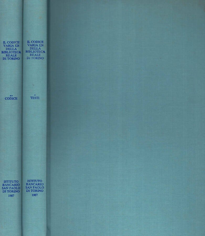 Opera completa in II tomi, muniti di custodia cartonata telata muta, segnata da mende da usura, imperfezioni da urti e ombrata da veli di polvere. Legature commerciali, copertine rinforzate, rivestite di tela monocolore, mute ai piatti e titolate ai dorsi, prive di imperfezioni, altrettanto ben conservati risultano gli interni dei volumi, con fogli di cartoncino color crema di buona qualità immacolati e come nuovi, il volume 1 contiene il testo del codice, il volume 2 le immagini, edizione fuori commercio, cura editoriale di Umberto Allemandi & C. per Istituto Bancario di Torino. N. pag. 254, n.n.