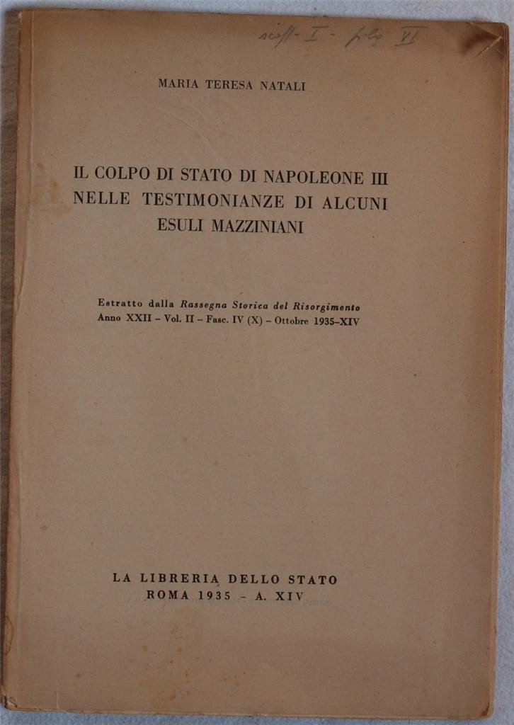 In 8. Dim. 25x18 cm. Pp. da 606 a 623. Interessante pubblicazione del 1935 scritto da Maria Teresa Natali. L'autrice parla del colpo di stato di Napoleone III nelle testimonainze di alcuni esuli mazziniani. Estratto dalla Rassegna storica del Risorgimento anno XXII Vol. II Fasc. IV Ottobre 1935. Dedica con firma dell'autrice al frontespizio. Copertina editoriale in buone condizioni generali con lievi usure ai margini e dorso. Legatura in buone condizioni. All'interno le pagine si presentano in ottime condizioni con rare fioriture. Interesting pamphlet of 1935 written by Maria Teresa Natali. The author talks about the coup d'etat of Napoleon III in testimonies of some Mazzini exulated. Extract from Rassegna storica of the Risorgimento year XXII Vol. II Fasc. IV October 1935. Dedication with signature of the author in the title page. Editorial cover in good general conditions slightly worn in the edges and spine. Binding in good conditions. Inside pages are in very good conditions with occasional foxings.