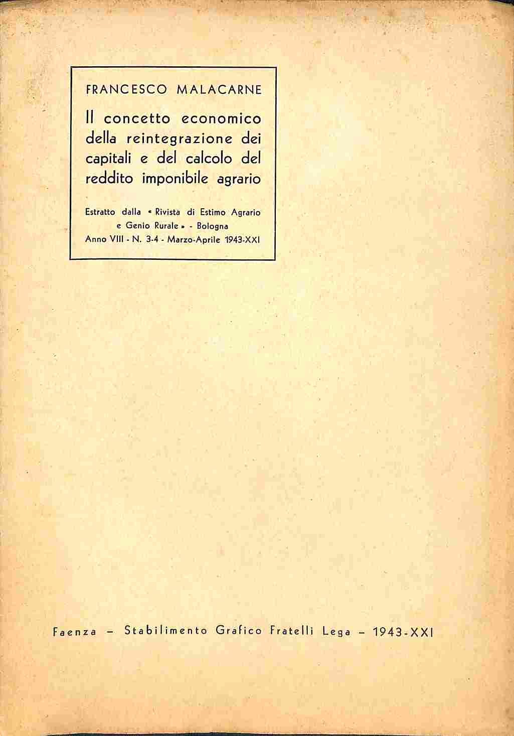 In 8 (cm 17 x 24), pp. 7 + (1 bianca). Brossura editoriale. Estratto editoriale dalla rivista di Estimo agrario e Genio Rurale.