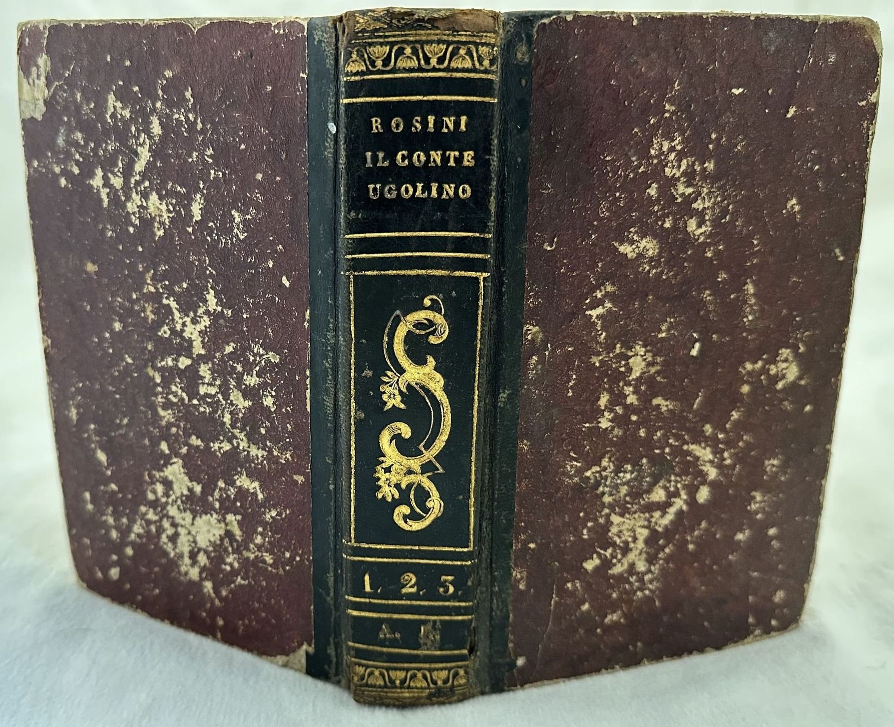 Edizione illustrata del 1844 di questo romanzo storico del letterato poeta e drammaturgo Giovanni Rosini (1766-1855). L'opera è basata sulla storia vera del Conte Ugolino, figura pisana del XIII secolo. All'interno è presente un incisione, due incisioni sono mancanti. Bella legatura in mezza pelle con titolo e decorazioni in oro al dorso. In buone condizioni. Copertina in mezza pelle in ottime condizioni generali con lievi usure ai margini e dorso. Legatura in buone condizioni. All'interno le pagine si presentano in buone condizioni con fioriture. Seconda e terza tavola mancante. Parte di pag. 6 e 7 mancante con testo manoscritto.In 16. cm 17,5x11 cm. Pp. XI+(1)+181+(3)+211+(3)+206+(2).Illustrated edition of 1844 of this historical novel written by Giovanni Rosini (1766-1855). The novel is based on the true story of Conte Ugolino, a man from Pisa of XIII century. Inside there is an engraving, two engravings are missing. In good conditions. Half leather coeval cover with gilted title and decorations in the spine in good general conditions lightly worn in the extremities. Binding in good conditions. Inside pages are in good conditions with foxing. The engravings in the frontspice of second and third tome lack. Part of pag. 6 and 7 missing with handwritten text. In 16. cm 17,5x11 cm. Pp. XI+(1)+181+(3)+211+(3)+206+(2).