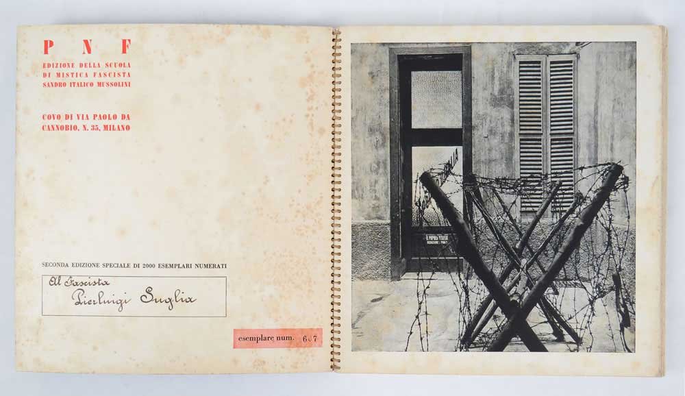 LIBROSeconda edizione speciale in 2000 esemplari numerati.Straordinario esemplare, il numero 1195 dei 2000 stampati, specialmente dedicato, con iscrizione manoscritta in elegante grafia sulla seconda di copertina, «Al Camerata Aldo Raimondi Dirigente della Scuola di Mistica Fascista». Aldo Raimondi (1902-1997) fu un talentuoso acquarellista di scuola realista, tenutario della prima cattedra di Acquerello a Brera dal 1939; poco note sono le sue affiliazioni fasciste, che questo esemplare mette particolarmente in luce. Copia freschissima e pulita, non conserva il raro astuccio editoriale.Nel febbraio 1940, in occasione del primo Convegno nazionale di Mistica fascista, il libro che fino a quel momento era stato visto solo dai 400 fortunati destinatari delle copie numerate ad personam stampate nell’ottobre del 1939 fu riproposto in due tirature: la presente serie di testa, rilegata a spirale di corda con i fogli doppi “alla giapponese” come l’edizione originale e pubblicata in 2.000 esemplari numerati riservata alle personalità e ai partecipanti al convegno; una tiratura brossurata non numerata posta in vendita. Rispetto all’edizione originale, la seconda cambia due fotografie (pp. 57 e 63), aggiunge ben otto pagine di nuovi contributi fotografici e citazioni scelte (dopo p. [73]) e le «Piante [topografiche] del Covo» su apposita carta ripiegata finale (Coronelli, «Tre luoghi reali e immaginari», n. 2b). -- «Il covo di via Paolo da Cannobio» è una pubblicazione-strenna che festeggia, in una tiratura riservata di sole 400 copie numerate ad persona, il passaggio di consegne dei locali del «covo», storica sede del «Popolo d’Italia» al numero 35 di via Paolo da Cannobio in Milano, a ridosso di piazza Diaz, affidatia da Mussolini al consiglio direttivo della Scuola di Mistica fascista “Sandro Italico Mussolini” il 18 ottobre 1939. La cerimonia di consegna si tenne l’11 novembre, officiata dal segretario del partito Achille Starace e ripresa dalle telecamere del cinegiornale. -- La Scuola di Mistica fascista era stata fondata nel 1930 dal giovane Niccolò Giani, laureando in giurisprudenza e membro attivissimo del GUF milanese, con il decisivo sostegno di Arnaldo Mussolini prima, e del figlio Vito poi. Obiettivo era il recupero del fascismo “autentico” delle origini, di trincea, rivoluzionario e antiborghese, da una prospettiva tuttavia spirituale, intrisa del culto della personalità del duce, orientata alla fondazione di una nuova umanità fascista. Un filone di pensiero pericolosamente irrazionale che non a caso rimase a lungo marginale, salvo riprendere credito e quota con il precipitare della situazione, verso la conclusione degli anni trenta. La conquista del «covo» fu da subito un obiettivo di Giani: nel 1932 si vide respingere una prima richiesta — rifiuto che lo indusse a congelare per qualche tempo l’attività della scuola. Ripresa con grande energia la direzione nel 1937 e cavalcata l’onda delle leggi antisemite e del razzismo spirituale, tra la fine de 1939 e il principio del 1940 l’istituzione creata da Giani giunse all’apice del successo: ottenne finalmente il «covo» e pochi mesi dopo, nel febbraio 1940, organizzò il primo Convengo nazionale di Mistica fascista, raccogliendo molte adesione e grande attenzione (T. Carini, «Niccolò Giani e la scuola di mistica fascista 1930-1943», Milano 2009). -- Fu proprio in occasione del convegno che venne preparata una nuova edizione del libro-strenna, con un’ambizione ben esemplificata dall’ampiezza della tiratura: 12.000 copie dichiarate, divise in 2.000 «speciali» e 10.000 normali per il grande pubblico. A questa tiratura dichiarata vanno tuttavia aggiunte altre serie numerate di copie speciali — a differenza delle 2.000 stampate su fogli semplici e non doppi “alla giapponese” — in numero di copie non dichiarato ma comunque non superiore a poche centinaia riservate a speciali categorie quali «i sansepocristi» o «i camerati del “Popolo d’Italia”». Rispetto all’edizione originale, la seconda edizione del 1940 cambia due fotografie (pp. 57 e 63), aggiunge ben otto pagine di nuovi contributi fotografici e citazioni scelte (dopo p. [73]) e le «Piante [topografiche] del Covo» su apposita carta ripiegata finale (Coronelli, «Tre luoghi reali e immaginari», n. 2b). -- Il libro è soprattutto fotografico, pubblicando suggestivi e inediti scatti in bianco e nero degli ambienti, dei documenti, dei personaggi: la palazzina al 35 di via Cannobio, anonima e triste, militarizzata appunto come un covo, assurge a simbolo delle origini umili e subitamente pugnaci del fascismo. Accanto alle fotografie, memorabili frasi mussoliniane in cubitale rosso, e la narrazione del «covo» e della nascita del fascismo affidata alla penna di Giorgio Pini, dal 1936 caporedattore del «Popolo d’Italia». Il modernissimo disegno del libro si deve all’architetto razionalista Giuseppe Pagano, il quale realizza da una parte uno dei più notevoli photobook della prima metà del Novecento italiano, ben degno — e anzi: colpevolmente assente! — dalla monumentale storia del libro fotografico pubblicata negli anni scorsi da Martin Parr e Gerry Badger. D’altra parte, con i fogli doppi “alla giapponese”, le pagine ripiegate a giocare con i volumi del libro, la legatura tipo spiralblock ma in corda grezza coordinata all’impressionante astuccio in canapa su cui campeggia il fascio e la scritta cubitale IL COVO, Pagano ha realizzato il libro-oggetto capolavoro dell’avanguardia fascista; come pure farà Depero con «A passo romano» (Trento 1943), Pagano rilegge tutto il più avanzato campionario della grafica anni trenta in chiave di «iconografia funerea della rivoluzione fascista» — per usare la felice formula coniata da Mino Argentieri proprio a proposito del cortometraggio «Il covo», prodotto da Dolomiti Film per la Scuola di Mistica fascista nello stesso 1941 (L’occhio del regime,