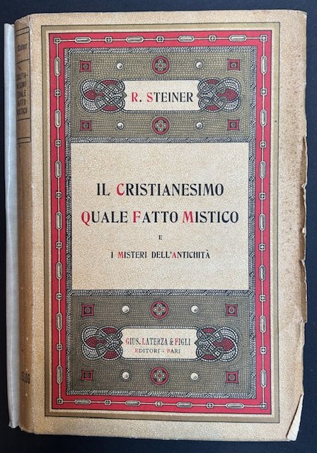 In-8°, pp. 169, brossura editoriale. In quest'opera l'autore prende le mosse dall'idea che nella formazione del cristianesimo fossero operanti realtà spirituali che si possono rilevare soltanto grazie all'indagine occulta. Si ammette così la possibilità di conciliare la mistica autentica con il pieno riconoscimento della conoscenza scientifica del nostro tempo. Rudolf Steiner fu un teosofo austriaco (Kraljevica 1861 - Dornach, Basilea, 1925), fondatore dell'antroposofia. Segretario generale della sezione tedesca della Società teosofica, ne uscì (1913) per un contrasto con Annie Besant, fondando una società dissidente, detta appunto di antroposofia, che ebbe la sua sede a Dornach in un edificio detto Goetheanum. Propugnava un potenziamento dei mezzi conoscitivi umani mediante pratiche di meditazione e di concentrazione che dovevano portare, attraverso l'ispirazione, fino all'intuizione. La storia era concepita da S. come svolgimento della lotta dualistica tra un Cristo solare e Ahriman. Importante l'influenza sulle sue concezioni del pensiero indiano e della filosofia di Nietzsche e, nel suo primo periodo, della filosofia della natura di Goethe. Si fece inoltre attivo propugnatore delle sue idee in campo pedagogico, dando vita a un'istituzione scolastica privata, le Waldorfschulen (Treccani)