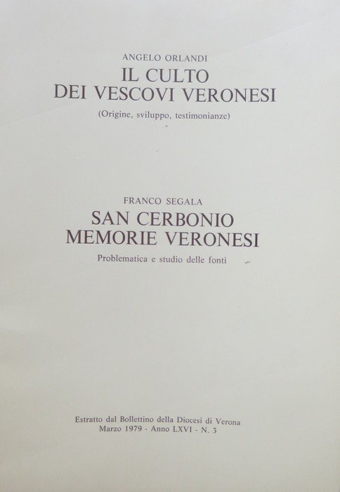 Il Culto dei vescovi veronesi: origine, sviluppo, testimonianze; San Cerbonio memorie veronesi problematica e studio delle fonti.