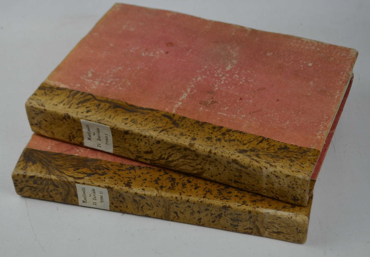 Due volumi di cm. 31, pp. (16) 363 (1); (4) 312. Leg. coeva in cartonato con dorso ricoperto in carta marmorizzata. Titoli ms. (posteriormente) su tasselli ai dorsi. Etichetta rimossa ai frontespizi. Esemplare particolarmente fresco e marginoso, verosimilmente in carta grande. Ben conservato. Interessantissima opera dedicata al popolo ebraico ed alle terre di Palestina; i profili storici esposti attraverso episodi biblici fungono da premessa ideale alla trattazione dedicata alla storia civile, militare e religiosa. Il secondo volume è appunto dedicato a finanze, tributi, clima, agricoltura, commercio, edilizia a Gerusalemme, navigazione, milizia ed armi.