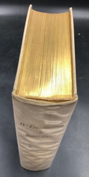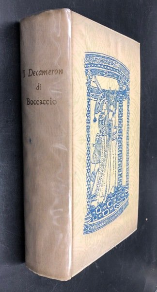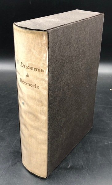 In-8° (cm. 21,9), pp. XXII, 670, (1) + 27 TAVOLE a COLORI fuoti testo in carta patinata (riproduzioni di affreschi da Taddeo Gaddi dal Chiostro di S. maria Novella, di Simone Martini dal Pal.Comunale di Siena, di Giotto, di ignoti dal Camposanto di Pisa e da San Gimignano., Legatura editoriale cartonata rivestita da tessuto in seta con fregi e figure al tratto in verde ai piatti (ombre ai bordi), titolo in oro al dorso, Taglio superiore dorato Sovraccoperta trasparente edit. in acetato. Cofanetto in cartone leggero marron muto. Proemio dell'Editore - Chiusa - Conclusione dell'Autore - Indice dei personaggi delle novelle