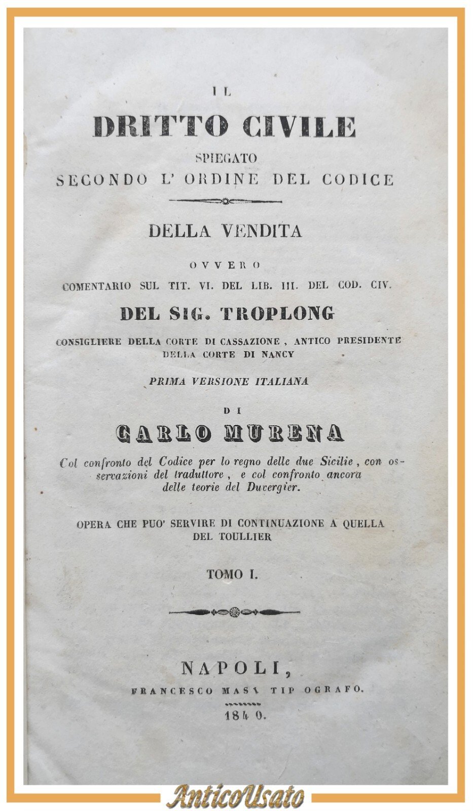 IL DIRITTO CIVILE di Troplong 2 volumi completo 1840 1841 Francesco Masi Libro