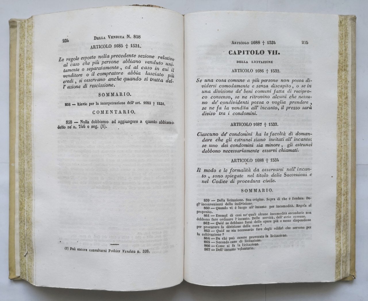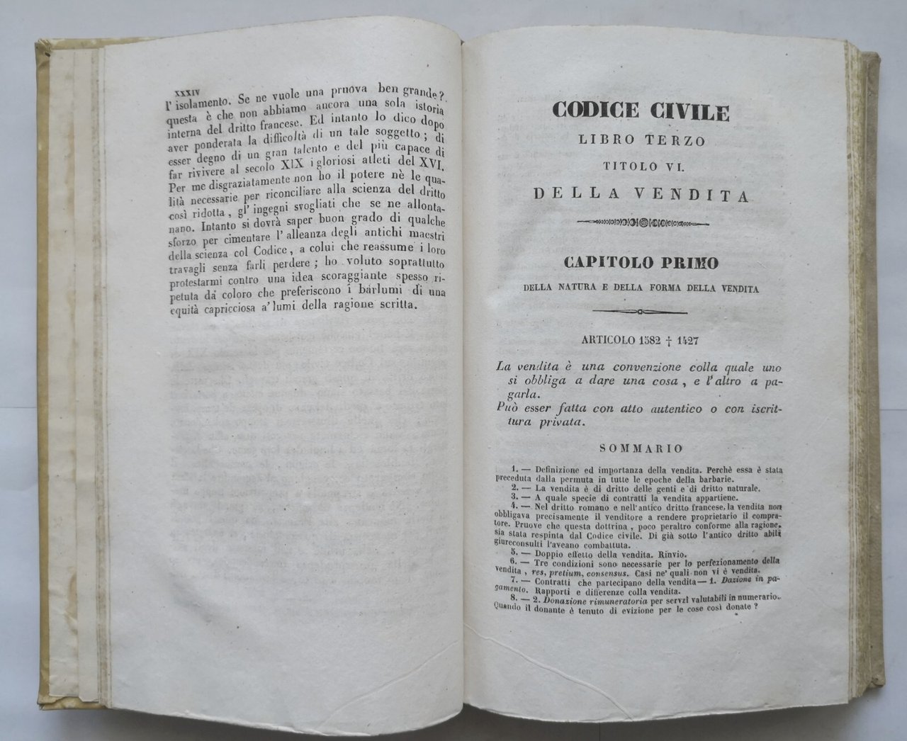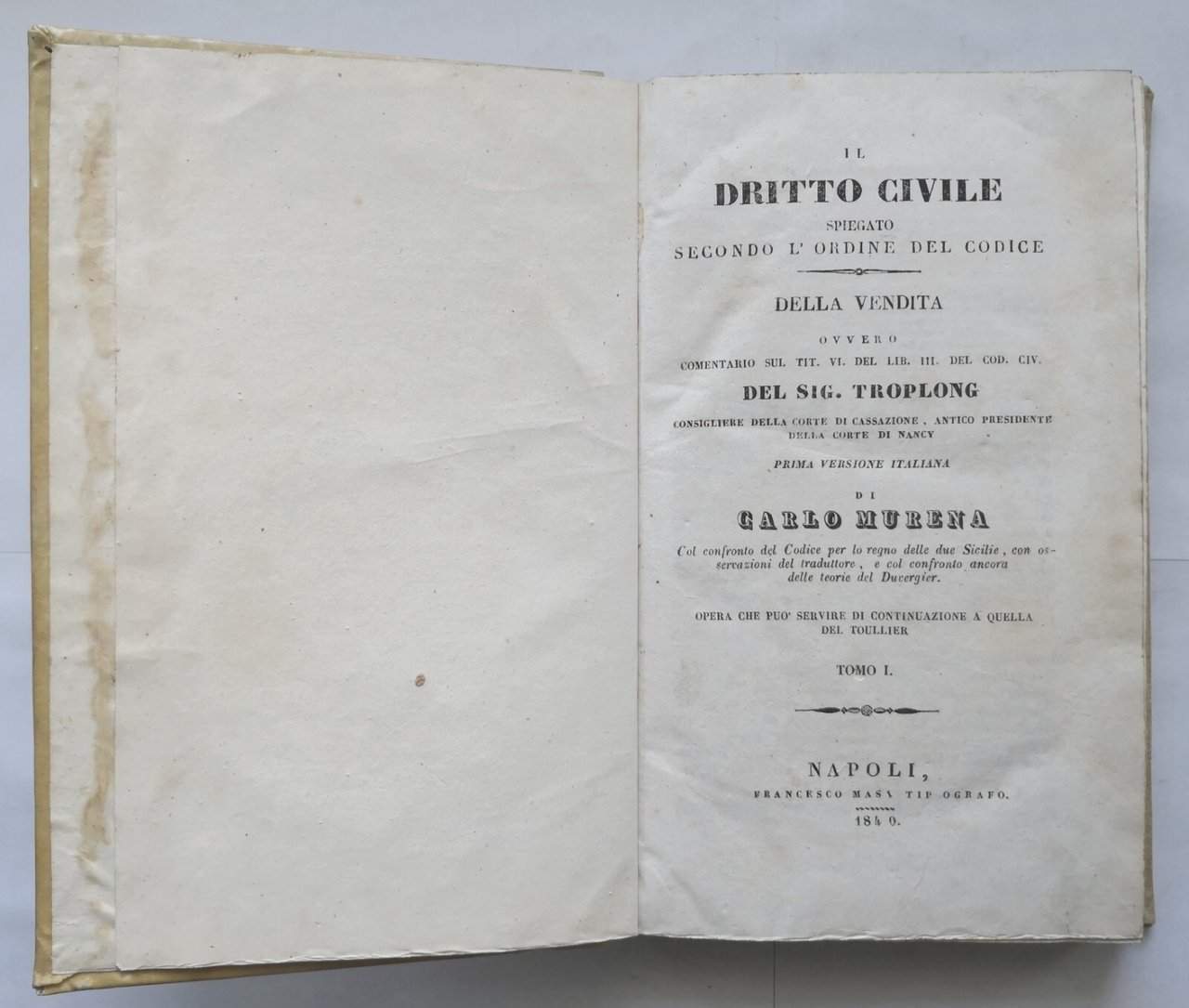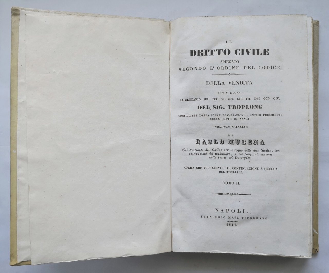 IL DIRITTO CIVILE spiegato secondo l'ordine del codice della vendita di Troplong. Prima versione italiana di Carlo Murena. Opera completa in due volumi.
