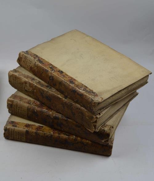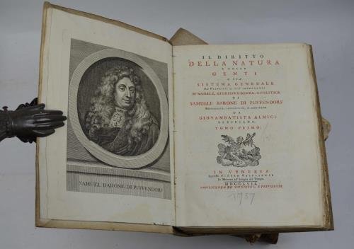 Quattro volumi di cm. 27,5, pp. (2) xlviii, 323 (1); 472; 395 (1); 536. Ritratto dell'autore inciso in rame all'antiporta del primo volume e primo frontespizio in rosso e nero. Legatura strettamente coeva in cart. alla rustica con dorsi ricoperti in carta marmorizzata e titoli manoscritti su tasselli. Esemplare particolarmente genuino e marginoso, ben conservato e stampato su carta di ottima qualità. Si tratta della prima, non comune edizione originale della traduzione italiana di questo caposaldo del pensiero giuridio-politico mondiale.