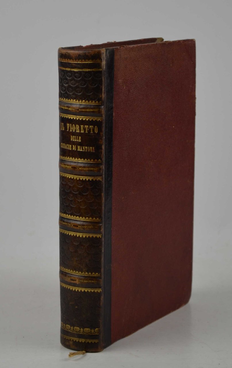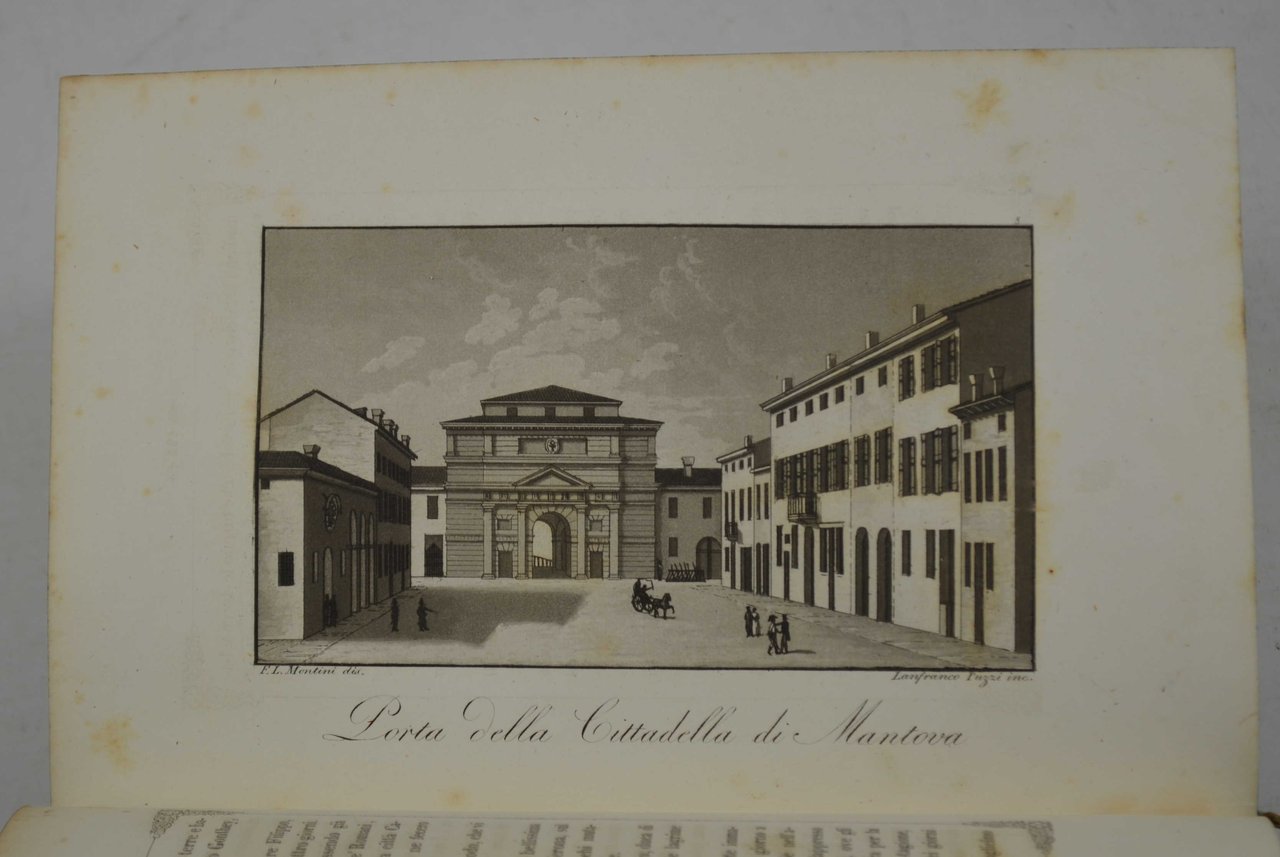 Cm. 22, pp. viii, 382 + (4) d'errata ed indice di collocamento delle tavole. Con testo interamente racchiuso entro cornice tipografica e 24 belle vedute e scorci della città di Mantova all'acquatinta. Solida ed elegante legatura cova in mezza pelle, dorso a nervi con titoli e ricchi fregi in oro ed a secco. Qualche naturale fioritura ed arrossatura sparsa e limitata prevalentemente alle carte di testo. Esemplare genuino, marginoso e ben conservato. Affascinante pubblicazione sulla città di Mantova, munita di un ampio apparato iconografico.