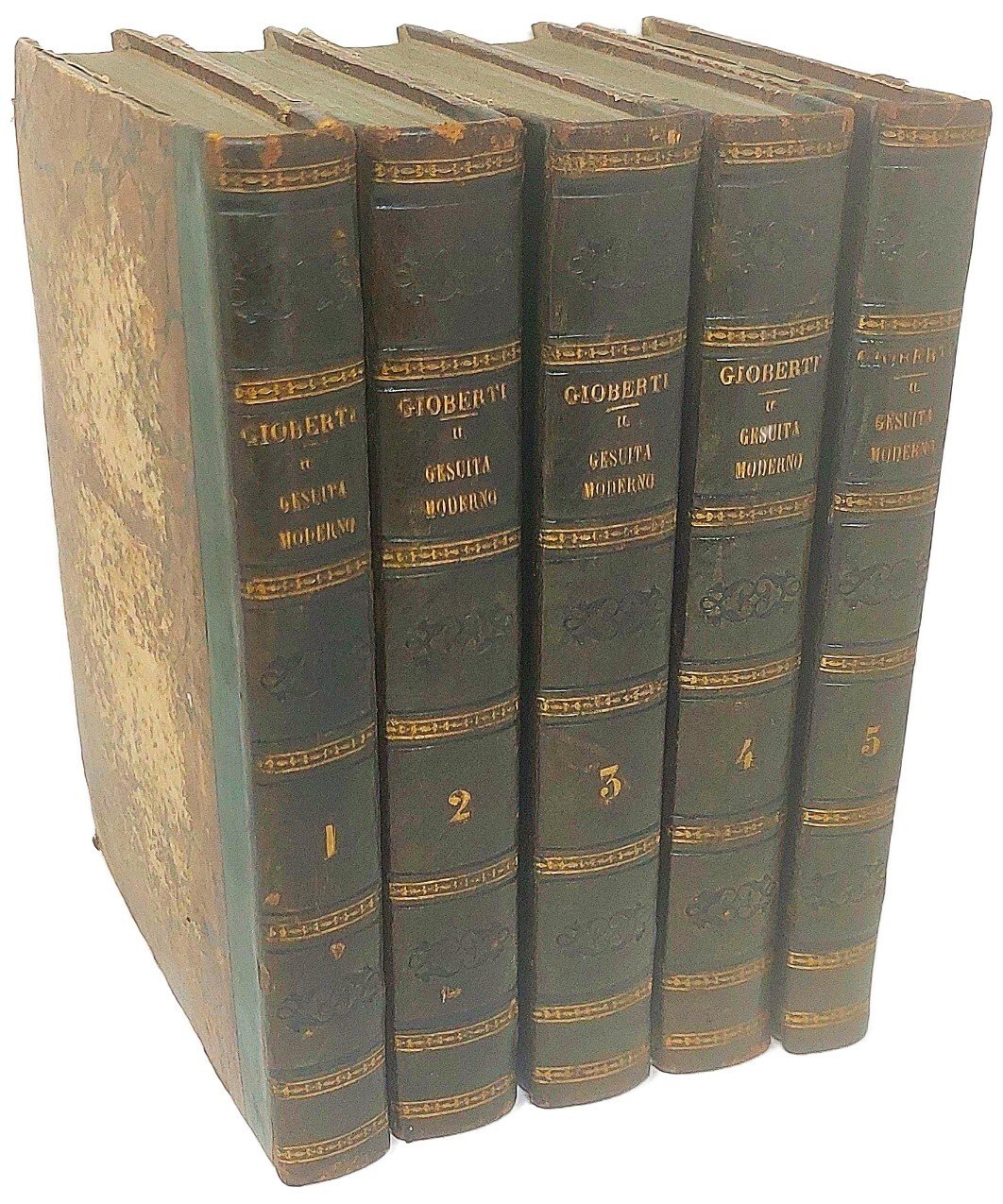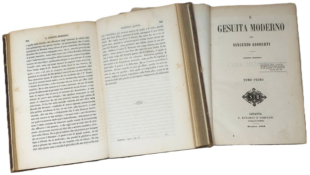 >5 vol. in-8, pp. XX, DXVIII; (4), 631; (4), 629; (4), 624; (4), 469. Legatura romantica in m. pelle verde, titolo e ricchi fregi oro ai dorsi. Prima edizione di questa celebre opera, "fierissima requisitoria contro la degenerazione della Compagnia di Gesù e il suo indirizzo etico, pedagogico e politico" (cfr. Rosi III, 227-230). Politicamente l'opera è importante perché combatte quella retriva corrente di Gesuiti che si opponeva alle idee liberali ed al moto nazionale italiano, contribuendo così anch'essa a preparare il ‘48. Ottimo esemplare Parenti 263. Biancardi-Francese p. 220.