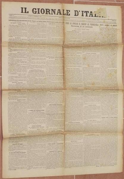 In folio. Dim. 58x43 cm. Pp. 4. Numero del 23 febbraio 1903 di questo raro quotidiano fondato a Roma nel 1901 e chiuso nel 1973. All'interno: Le navi francesi con bandiera italiana, Come si svolse il blocco al Venezuaela, Ferrovia inglese da Addis Abeba al Nilo, Il telegrafo senza fili Marconi applicato per l'arresto di due assassini, Il carnevale a Frascati, Infezione equina a Pisa, Tragica escursione al Gran Sasso, Enrico Morselli e l'opera di Zola, pubblicità d'epoca. In buone condizioni. Raro. Brossura editoriale in buone condizioni generali con lievi usure ai margini e dorso. Piegature. All'interno le pagine si presentano in buone condizioni con rare fioriture. Piegature. Strappi con perdita di testo. Resti di etichetta. Number of the 23rd of february 1903 of this scarce daily newspaper established in Rome in 1901 and closed in 1973. Inside: French ships with italian flag, Block to Venezuela, English railway from Addis Abeba to Nilo, Wireless telegraph Marconi applied for the arrest of two murderers, Carnival in Frascati, Horse infection in Pisa, Tragic excursion in Gran sAsso, Enrico Morselli e l'opera di Zola, advertisings. In good conditions. Scarce copy Editorial cover in good general conditions slightly worn in the edges and spine. Foldings. Inside pages are in good conditions with occasional foxings. Foldings. Tears. Signs of label.