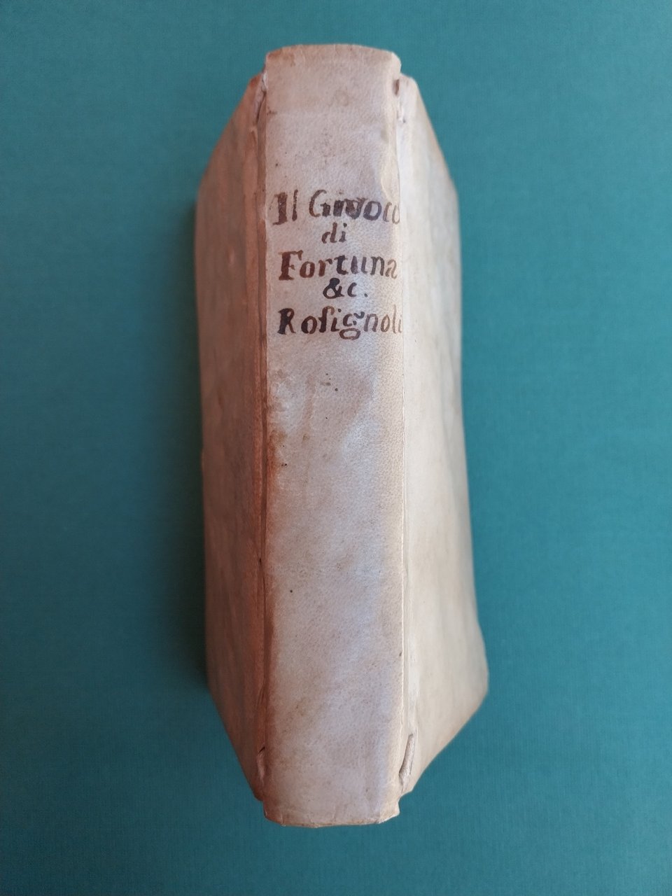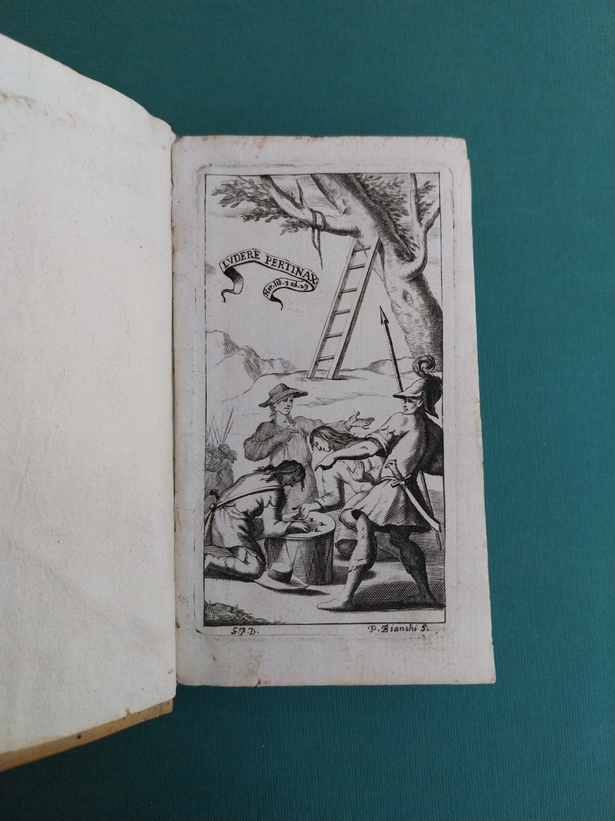 In 12° (148 x 80mm), pp. (20), 241, bellissima antiporta incisa in rame da P. Bianchi raffigurante due giocatori di dadi ad un tavolo interrotti dall'arrivo di una guardia con in alto a sinistra il motto 'Ludere pertinax', capilettera e finalini in xilografia. legatura in piena pergamena coeva con nervi passanti, titolo manoscritto al dorso. Ottimo esemplare genuino e fresco. Edizione originale. Rosignoli Carlo Gregorio (Borgomanero 1631- Milano 1707) Destinato inizialmente all'insegnamento, diede lezioni di retorica nei collegi di Novara, Cremona e Milano, di filosofia a Genova e Milano, di sacra scrittura, teologia scolastica e morale a Torino, Genova e Milano. Ma ricoprì diversi altri uffici: fu prefetto degli studi, padre spirituale, responsabile delle congregazioni, confessore, consultore del provinciale, ammonitore del superiore, esaminatore dei professi, rettore del collegio di Como (1678-81), preposito della casa professa di S. Fedele in Milano (1687-90) e del noviziato e casa di probazione a Milano (1694-98). Entrò nella Compagnia di Gesù il 7 febbraio 1651. Dall'esperienza di guidare comunità di formazione religiosa e dettare cicli di esercizi sulla «buona morte» scaturirono alcuni testi che sollecitavano i giovani a compiere una corretta scelta vocazionale in vista del riscatto eterno (L'elettione della morte, Milano 1693), a discernere con cura le amicizie (L'elettione dell'amico, Bologna 1698) e a evitare il vizio del gioco d'azzardo (Il giuoco di fortuna, Milano 1700).