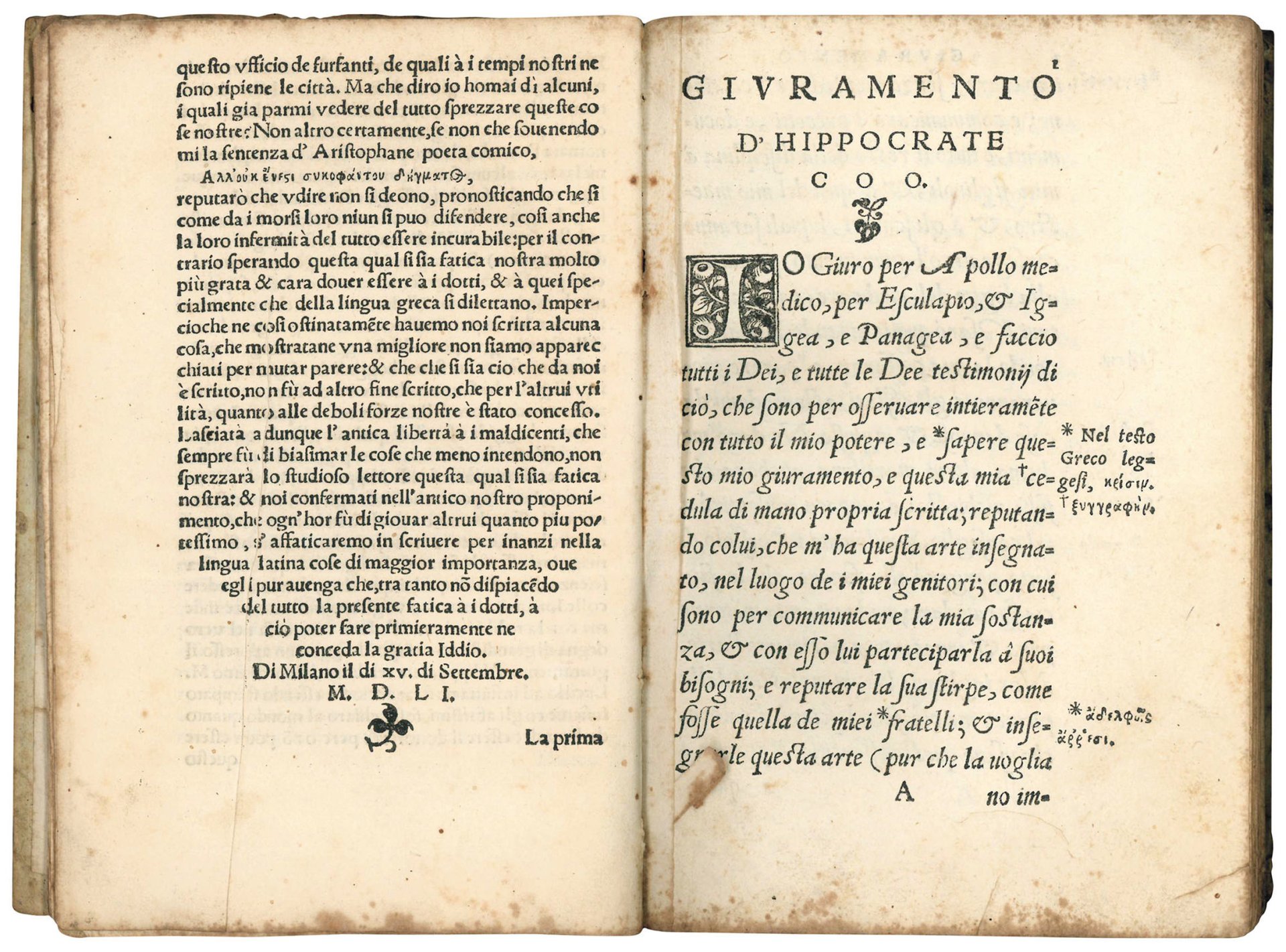 Rare first edition of the first translation into Italian of the Hippocratic Oath and a selection of Hippocrates' Aphorisms. The translation, the first of any of Hippocrates' works into Italian, is by Lucillo Filalteo, born Lucillo Maggi in Brescia in 1501. He studied in Padua and Bologna, graduating in 1535. He then became a professor of medicine in Turin and a member of the Accademia degli Affidati in Pavia. He died in 1578. The Greek and Italian commentary is by the Milanese physician Giovanni Francesco Martignoni (fl. mid 16th cent.), who taught at the universities of Pavia and Milan.