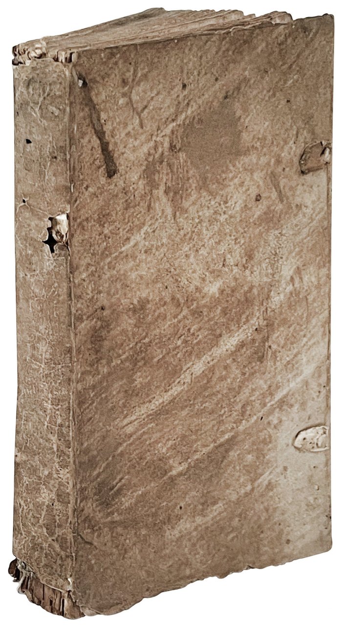 8vo (168x110 mm). [20], 120 [i.e. 119], [1] pp. Page 52 omitted in pagination. Collation: **10 A-G8 H4. Printer's device on the title page. Colophon at l. H4r, errata at l. H4v. Woodcut decorative initials. Roman and italic types with marginalia printed in Greek. Contemporary limp vellum with remains of ties (darkened and soiled, lacking bottom edge of spine). On the front flyleaf contemporary ownership inscrption “[…] hic liber est Alessandri Capponi” (repeated on the title page). Marginal foxing, heavy worming mostly at gutter of pp. 68-80 (sligtly affecting the text), a genuine copy in its first binding.