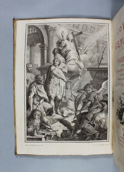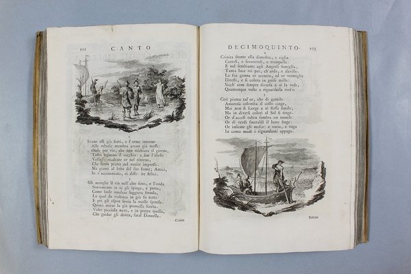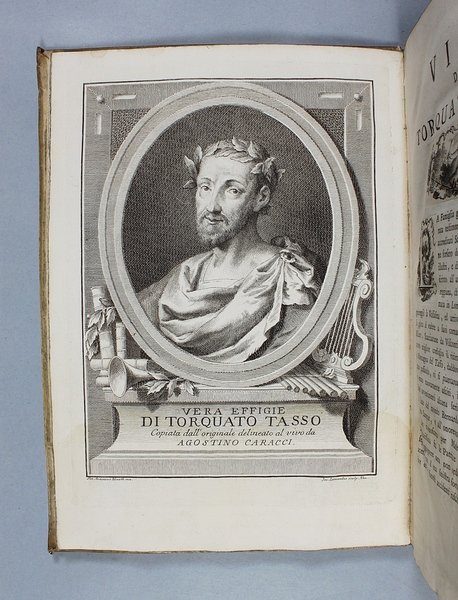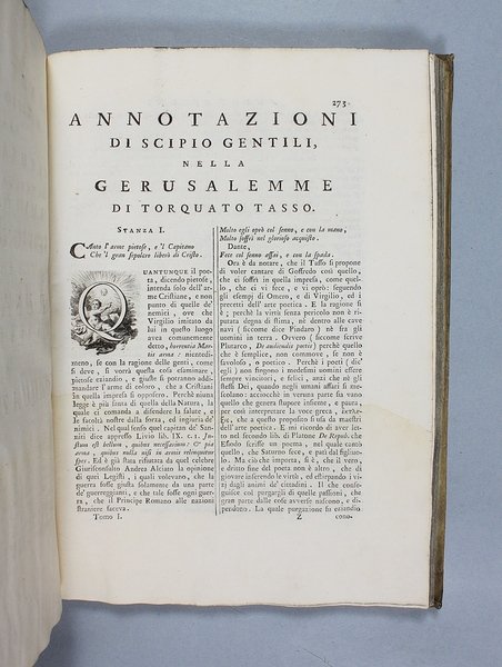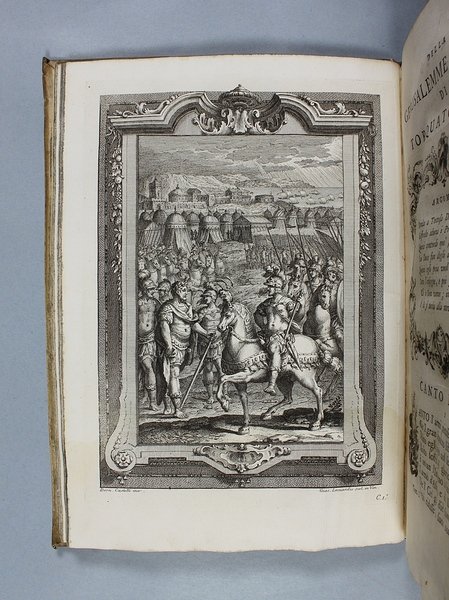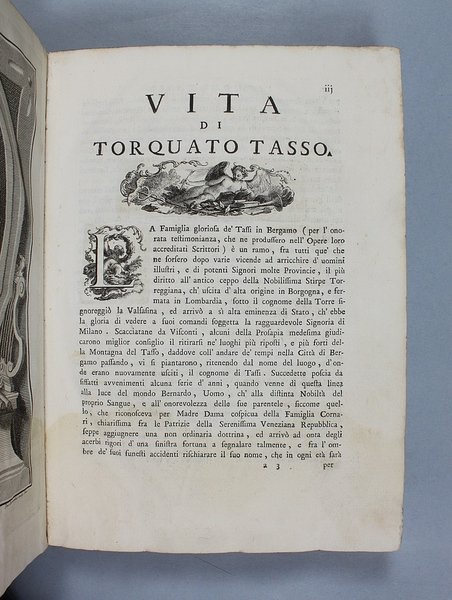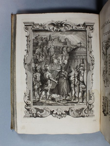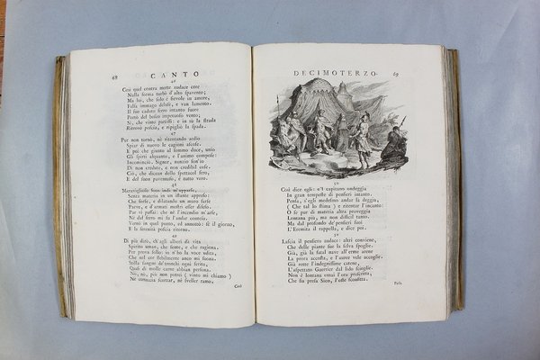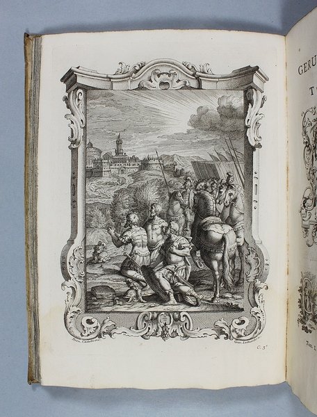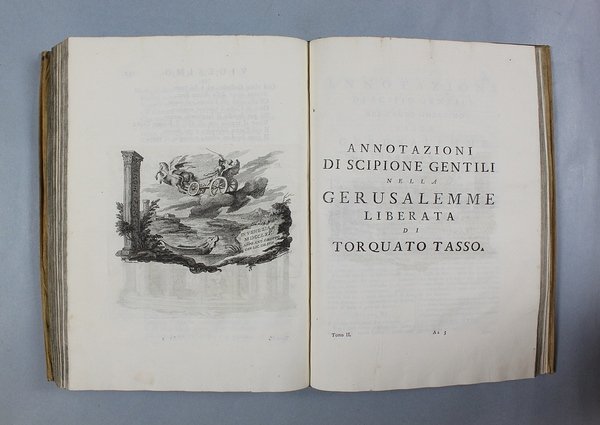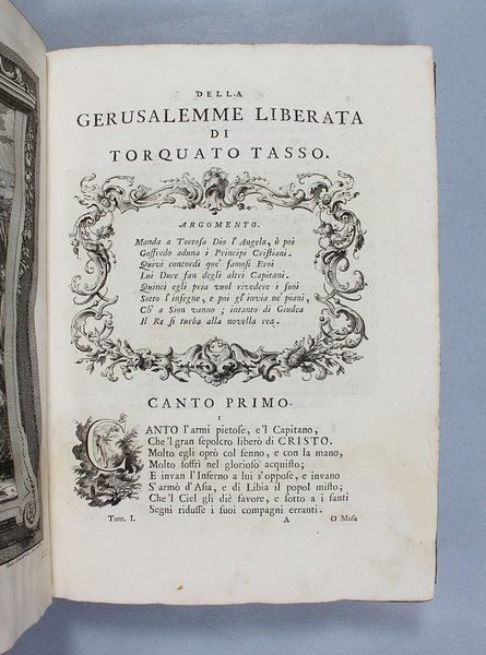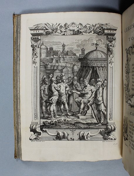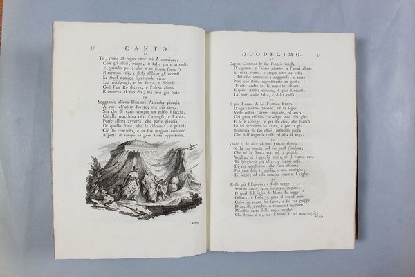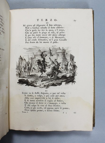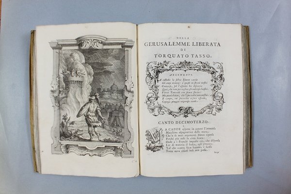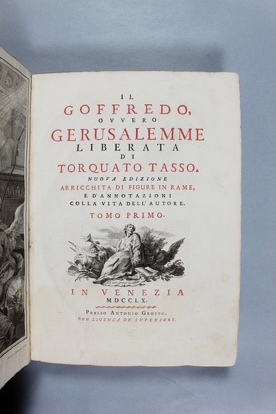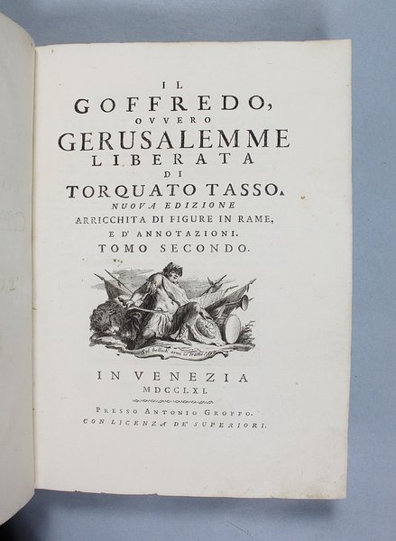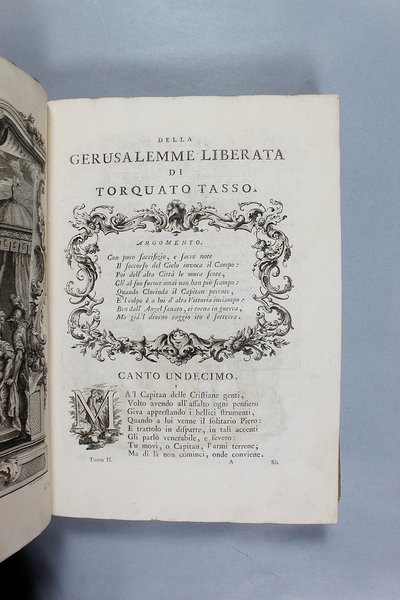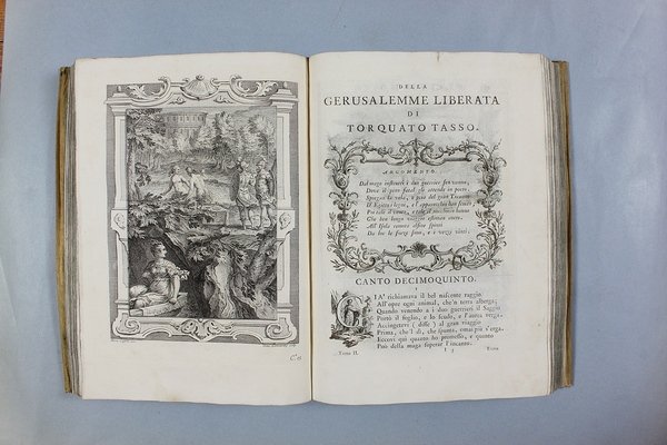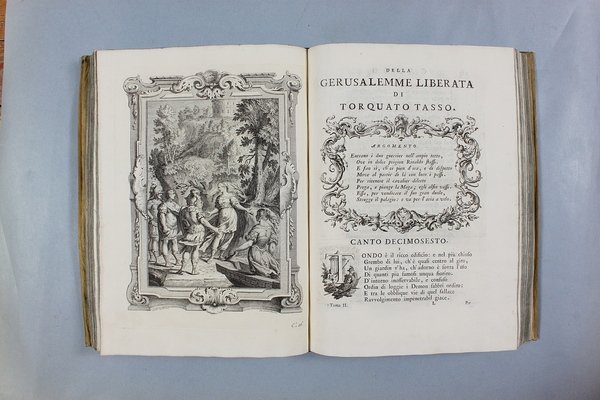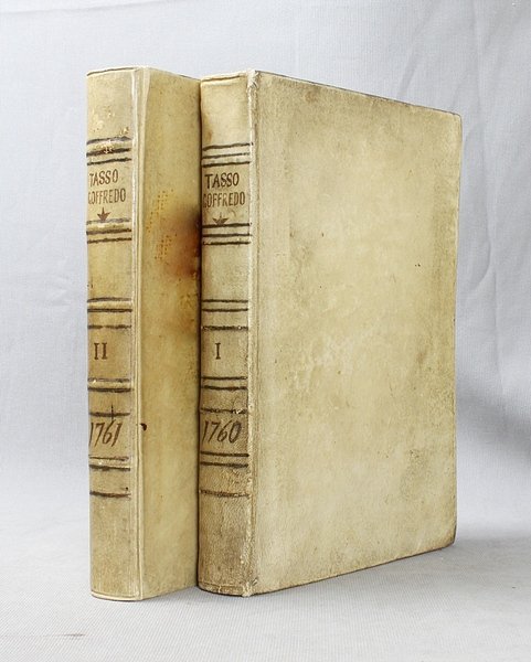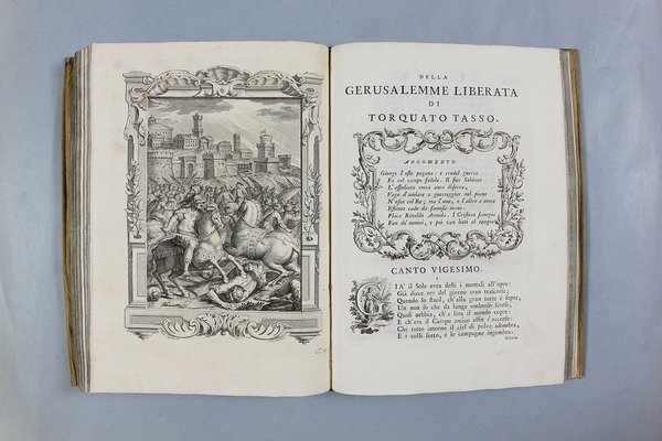 Venezia, Antonio Groppo, 1760-1761. Due volumi in-4ø; occhietto, antiporta figurata, titolo, ritratto dell'autore, XXX pp., 364 pp., 10 tavole fuori testo, XII pp. (compresi occhietto e titolo), 360 pp., 10 tavole fuori testo; legatura coeva in tutta pergamena, titolo manoscritto al dorso. Lieve gora al margine basso del primo volume. L'antiporta e il ritratto sono di Antonio Novelli, come pure le 95 incisioni a mezza pagina, mentre le 20 tavole, una all'inizio di ciascun canto, sono di Bernardo Castello, tutte poi incise dal Leonardis. Gli argomenti di ciascun canto, opera di Orazio Ariosti, sono incorniciati in un fregio e la prima lettera Š finemente incisa ed istoriata. Edizione pregiata, annotata da Scipione Gentili e Giulio Gustavini. Alla fine di ogni volume vi sono le varianti d'autore. "Questa edizione merita di essere annoverata fra le pi— belle ed ornate che si abbiano della Gerusalemme, non essendosi dallo Stampatore risparmiata diligenza, n‚ spesa, per renderla vaga e singolare nel suo genere. Ella Š ricchissima, pi— che altra, di rami. " (Serassi). "Nel 1760-1761 apparve a Venezia una nuova edizione della Gerusalemme Liberata, adorna di tavole all'inizio dei canti e di numerose vignette al loro interno: le prime furono incise da Giacomo Leonardis che riprodusse le tavole illustrate da Bernardo Castello contenute nell'edizione 1617 del poema. Le seconde, incise sempre da Leonardis, furono invece tratte da disegno di Pietro Antonio Novelli" (Donvito-Ton). Tassiana 270. Gamba 948. Guidi, p. 41. Morazzoni, p. 256. V.C. Donvito-D. Ton, Tiepolo Piazzetta Novelli, L'incanto del libro illustrato nel Settecento veneto, Mostra, Padova 2012, p. 274. .