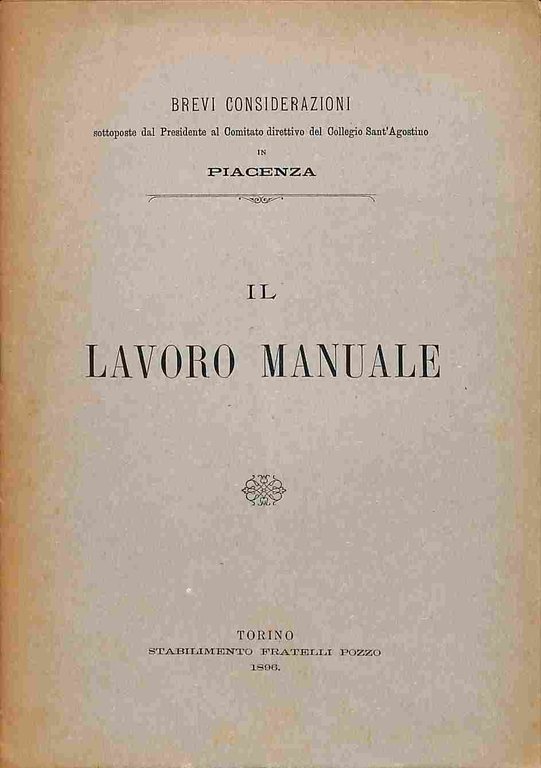 In 8 (cm 15,5 x 22,5), pp. 11 + (1 bianca). Omaggio autografo al frontespizio. Brossura editoriale. Considerazioni sul lavoro manuale come mezzo educativo, di matrice froebeliana, in uso presso scuole estere e la cui applicazione e' auspicabile, secondo l'Autore, anche in Italia, presentate al Presidente del Comitato Direttivo del Collegio Sant'Agostino di Piacenza.