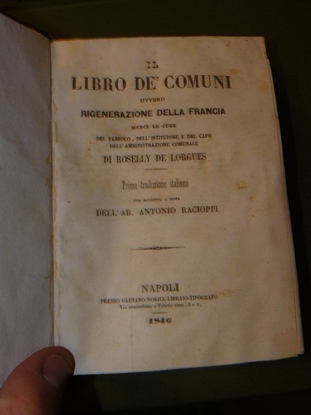 Il libro de' Comuni ovvero rigenerazione della Francia mercè le cure del Parroco, dell'istruttore e del capo dell'amministrazione comunale. Prima traduzione italiana con aggiunte e note dell'Ab. Antonio Racioppi.