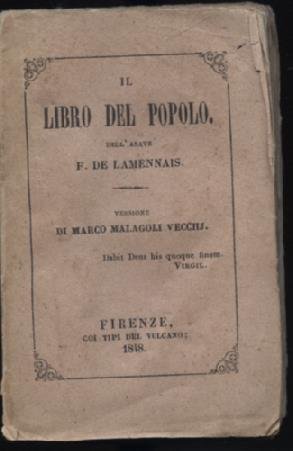 In-24°, pp. 176, brossura editorial riquadrata. Fioriture. Abili restauri al dorso. Buona copia in barbe. Probabile prima edizione italiana (nel 1848 furono pubblicate in contemporanea fra loro varie edizioni italiane dell'opera in diverse città [Palermo, Bologna, Livorno e due a Firenze], ma non è possibile determinare l'anteriorità di una rispetto alle altre). L'opera, composta da uno dei massimi scrittori cattolici dell'Ottocento, riprende idealmente lo spirito delle Paroles d'un croyant ed è un fervido manifesto in favore di un cattolicesimo sociale, critico nei confronti delle angustie della borghesia del tempo e basato su una lettura dei Vangeli dalle venature fortemente umanitaristiche. 'Le 'Livre du Peuple' caractérise la dernière phase de l'évolution de Lamennais ; il en marque également le terme, qui fut le socialisme' (Boutard, III, p. 204). 'Con caldi accenti, l'autore si rivolge al popolo per istruirlo nei suoi doveri e nei suoi diritti. Il movimento umanitario che doveva confluire nei rivolgimenti europei del 1848 si manifesta qui con una delle sue voci più sincere: lo stesso Cristianesimo, sentito come religione degli umili, guida le argomentazioni di fratellanza e di carità. In nome di un liberalismo approfondito nella meditazione del messaggio di Gesù, il Lamennais proclama la redenzione degli oppressi e l'indipendenza delle nazionalità conculcate. Così la società e il mondo, concepiti nella loro vera natura - per lo spirito di Dio inveratori nell'azione del Popolo - cesseranno di soggiacere alle lotte accese dagli opposti interessi delle classi. Per l'ispirazione, l'opera avrà un riferimento nei Doveri dell'uomo di G. Mazzini, che sempre ebbe per il Lamennais affetto e ammirazione' (Carlo Cordié in Dizionario Bompiani delle Opere, IV, p. 395). Cfr. (varie edizioni francesi): Goldsmiths, 30759. Escoffier, 1313. Vicaire, IV, 1092-1093. Boutard, cit. Quérard, II, 550.