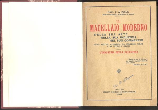 IL MACELLAIO MODERNO NELLA SUA ARTE NELLA SUA INDUSTRIA NEL SUO COMMERCIO.<BR>GUIDA PRATICA ILLUSTRATA DA NUMEROSE FIGURE E DA TAVOLE A COLORI. L'INDUSTRIA DELLA SALUMERIA.