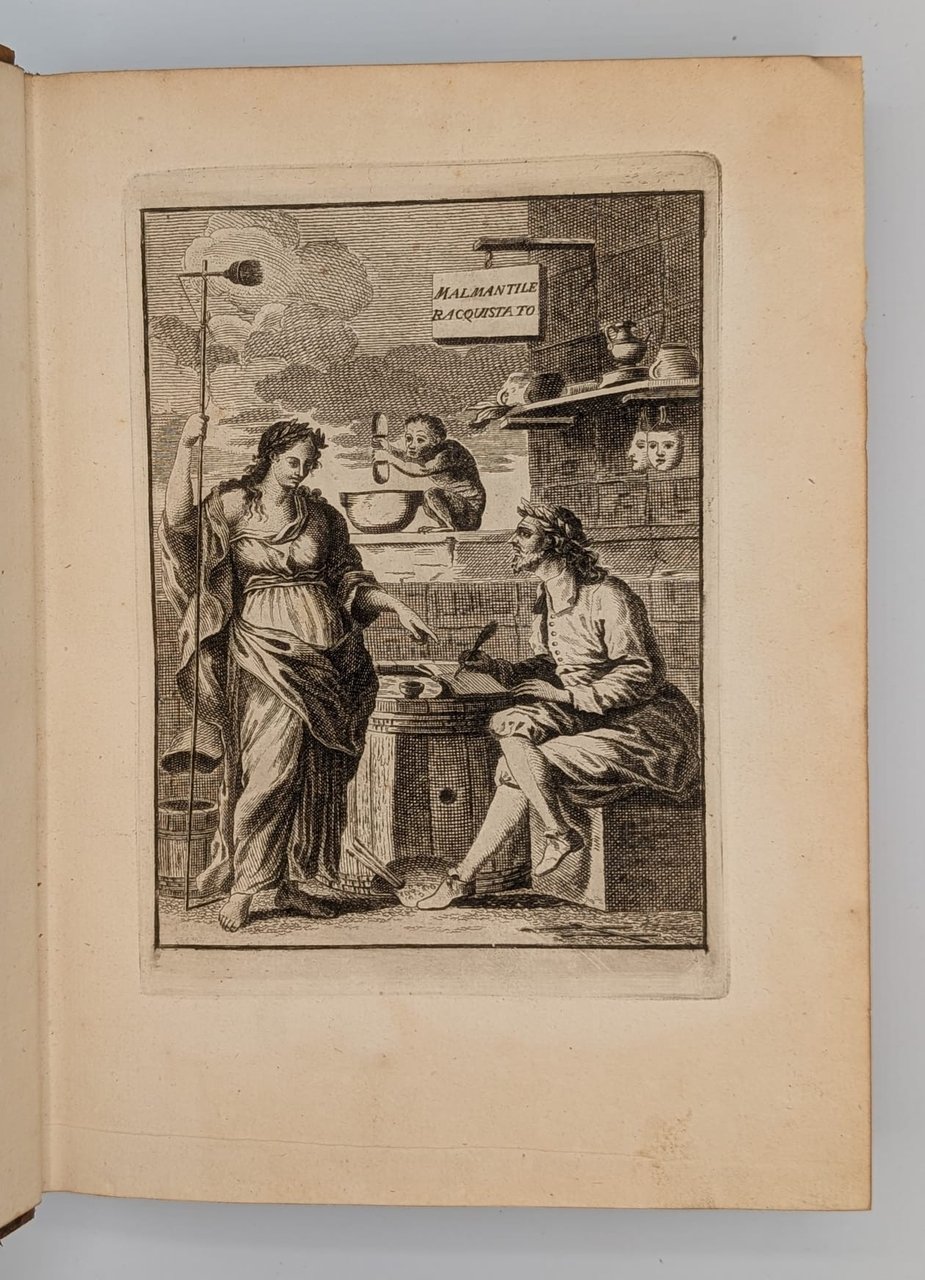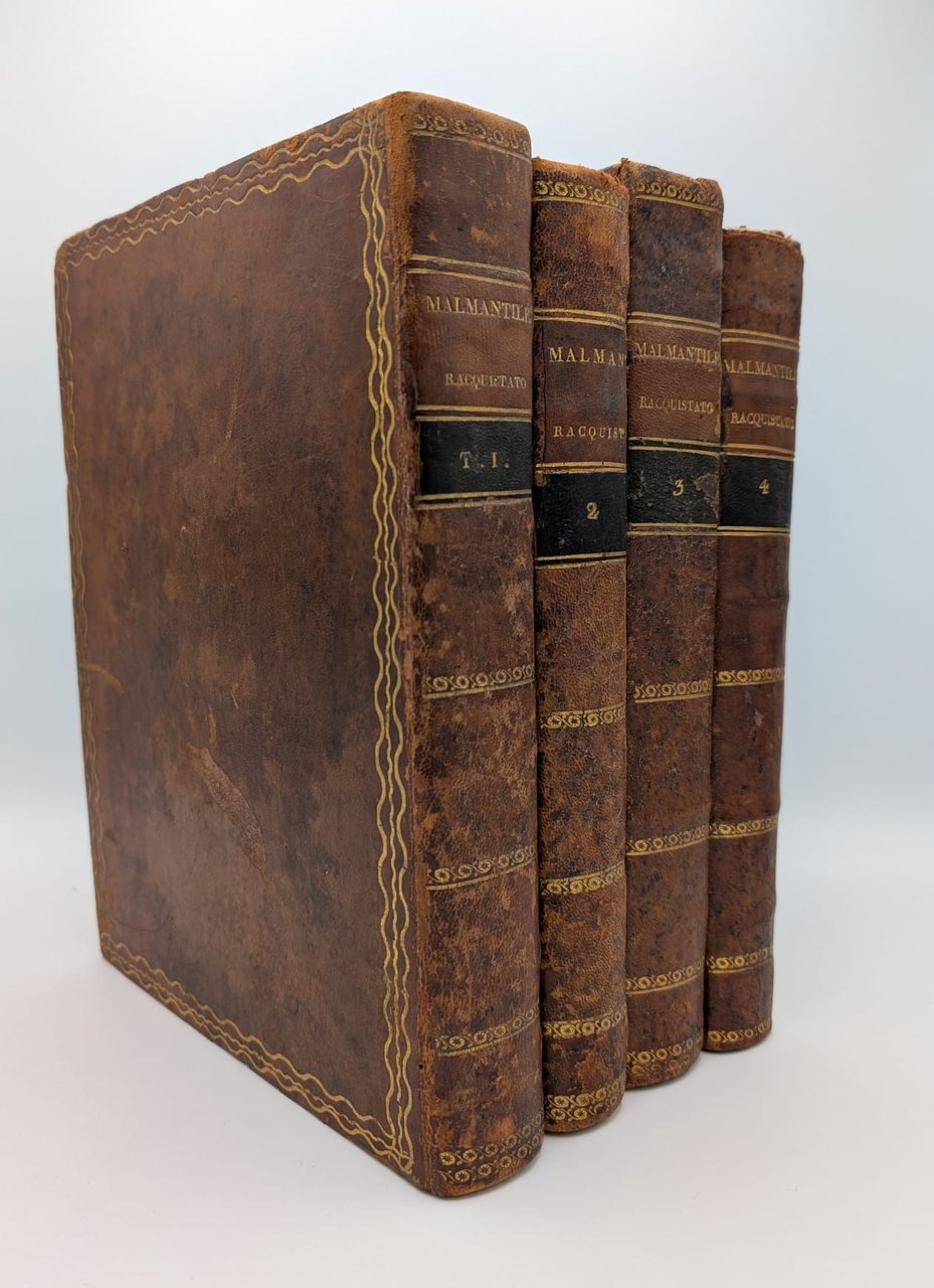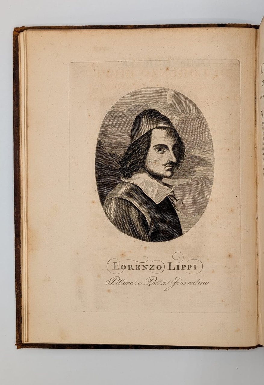 Zipoli Perlone (Lorenzo Lippi): Il Malmentile racquistato di Perlone Zipoli colle note di Puccio Lamoni e d'altri. Edizione conforme alla Fiorentina del 1750. Prato, Stamperia Luigi Vannini, 18154 Voll. In-8 (Cm 27 x 20), pp. XXXXVIII-235 - 232 - 259 - 249, legatura piena pelle con titoli al dorso e fregi in oro ai piatti. Tavola all'antiporta, vignetta xilografica al primo frontespizio, due ritratti fuori testo, in ovale, di Lorenzo Lippi e Paolo Minucci, albero genealogico della famiglia Minucci. Due belle testatine incise alla pagina VI ed alla carta A del primo volume. Ampio commento. Tagli dorati. Dorsi un po' consumati, mancanza della cuffia del volume 4 e due piccole mancanze al margine alto interno tra dorso e piatto anteriore. MOLTO BUONO