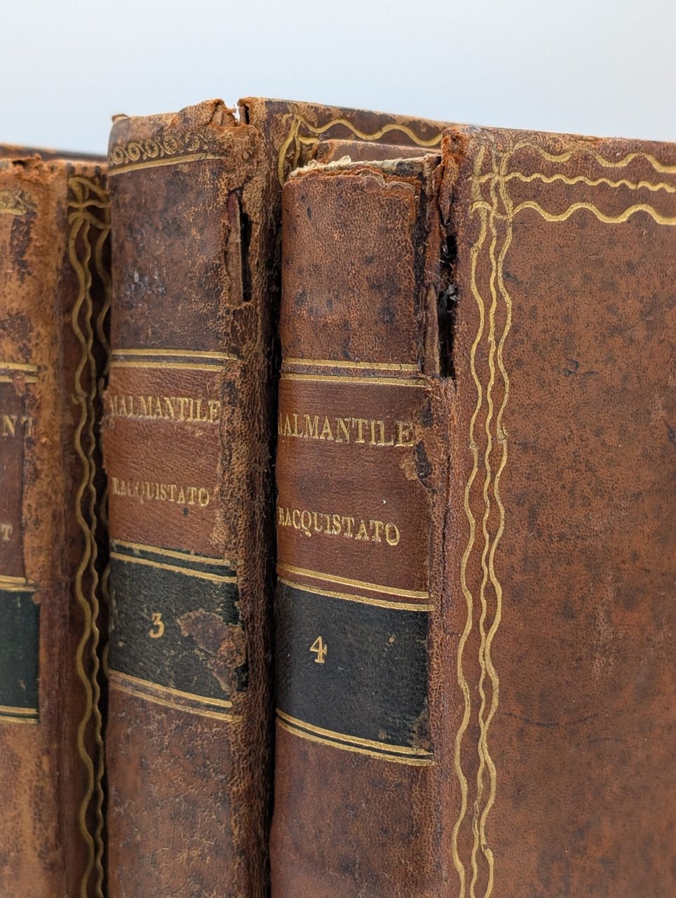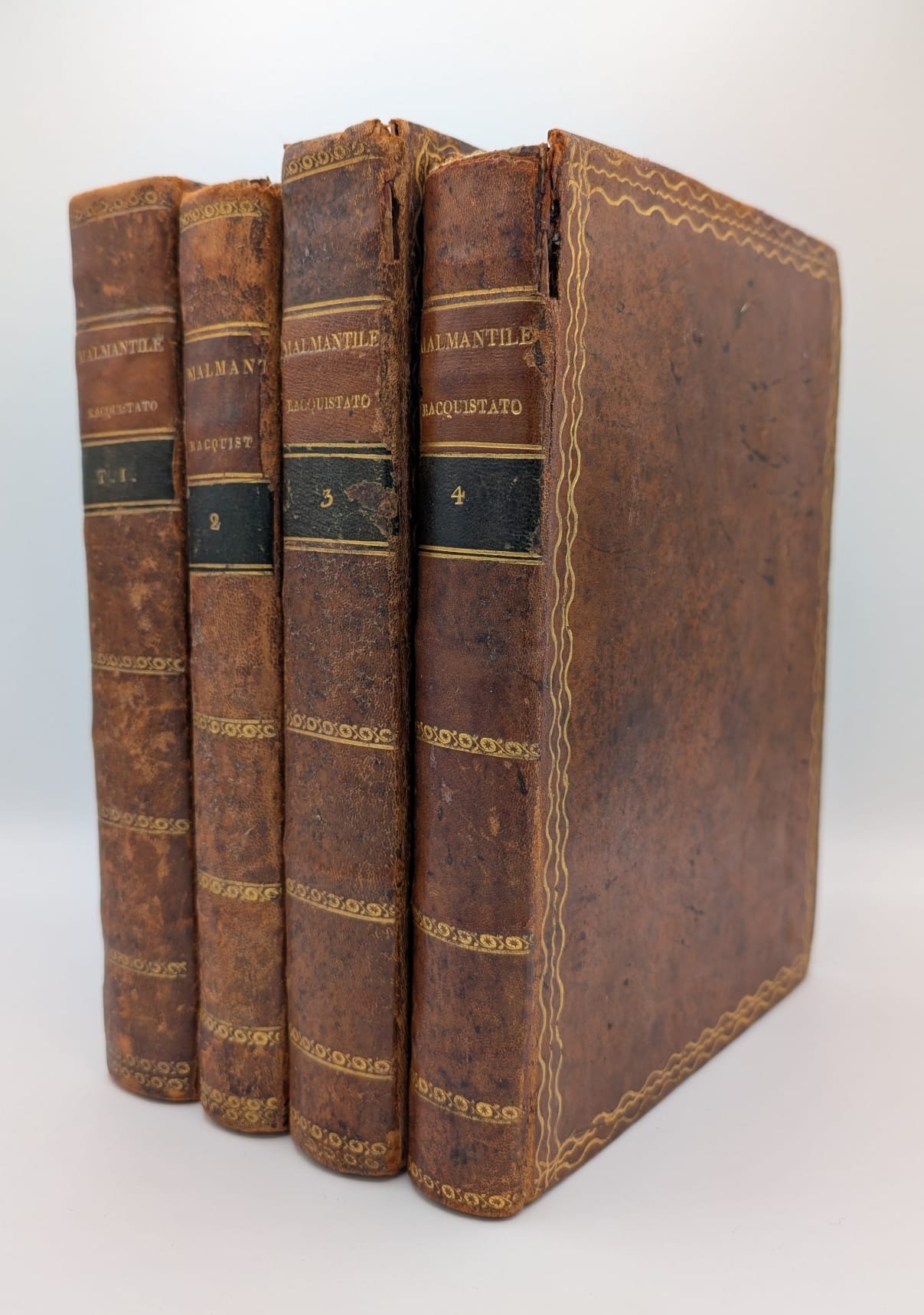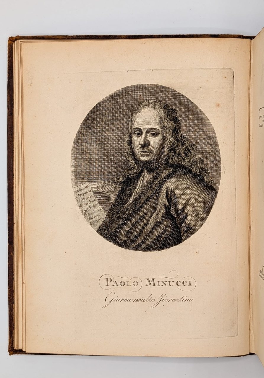 Zipoli Perlone (Lorenzo Lippi): Il Malmentile racquistato di Perlone Zipoli colle note di Puccio Lamoni e d'altri. Edizione conforme alla Fiorentina del 1750. Prato, Stamperia Luigi Vannini, 18154 Voll. In-8 (Cm 27 x 20), pp. XXXXVIII-235 - 232 - 259 - 249, legatura piena pelle con titoli al dorso e fregi in oro ai piatti. Tavola all'antiporta, vignetta xilografica al primo frontespizio, due ritratti fuori testo, in ovale, di Lorenzo Lippi e Paolo Minucci, albero genealogico della famiglia Minucci. Due belle testatine incise alla pagina VI ed alla carta A del primo volume. Ampio commento. Tagli dorati. Dorsi un po' consumati, mancanza della cuffia del volume 4 e due piccole mancanze al margine alto interno tra dorso e piatto anteriore. MOLTO BUONO