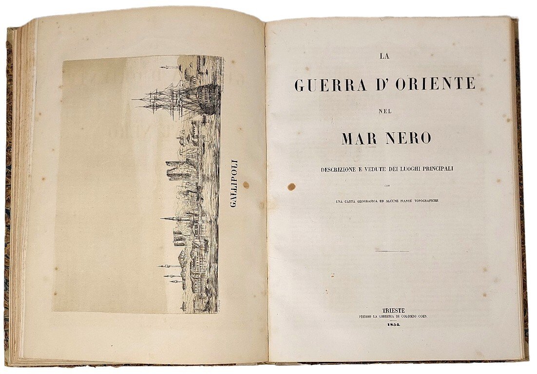 >in-4 (mm 318x230) pp. 131, (1); pp. 78; leg. mezza pergamena, titolo oro su tassello al dorso. La prima opera è illustrata da 1 carta geografica su doppio foglio "Guerra nel Mar Baltico", 1 "Pianta militare di Cronstadt" e 13 vedute litografiche di V. Stranski: Capo Kullen, Cronstadt, Nuovo Osservatorio di Cronstadt, Cristianstadt, Pietroburgo, Reval, Abo, Abo veduta dal ponte, Isole Aland, Sveaborg, Gustavsvern, Barosund, Nargen. Nella seconda opera sono presenti 2 carte geografiche: "Guerra d'Oriente-Mar Nero" e "Guerra d'Oriente-Crimea”; 1 pianta militare di Sebastopoli e 10 tavole di vedute litografiche: Gallipoli, Varna, Kustungi, Odessa, Batum, Trebisonda, Sinope, Scutari, Sukhum Kalè, Anapa. Prima edizione di questa descrizione delle città che si affacciano sulle coste del Mar Baltico (Finlandia, Svezia, Stati baltici e Russia), pubblicata nel 1854 nel contesto della guerra di Crimea (da ottobre 1853 a febbraio 1856). Tutte le litografie, eccetto la mappa, sono firmate da V. Stranski e stampate da Colombo Coen. Buon esemplare con comuni bruniture e fioriture della carta.