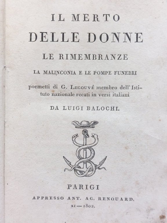 Il merto delle donne, Le rimembranze, La malinconia e Le pompe funebri. Poemetti [.] recati in versi italiani da Luigi Balochi.
