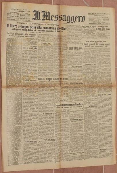 In folio. Dim. 59x45 cm. Pp. 8. Numero del 8 maggio 1927 dello storico quotidiano "Il Messaggero" fondato nel 1878 da Luigi Cesana con sede a Roma. All'interno: Il libero sviluppo della vita economica mondiale (L'Italia alla conferenza di Ginevra), Parla il delegato italiano on. Belloni, De Pinedo partirà stamane per Boston, Scavi in Caldea, Il campionato dei veterani ciclisti, Il "Circuito delle tre valli" a Palestrina, Terni: i propositi della "Stella del lavoro", Rieti, Cina, Unione industriale fascista umbro-sabina ecc. Pubblicità d'epoca. Brossura editoriale in buone condizioni generali con lievi usure ai margini e dorso. Piegature. Legatura in buone condizioni. All'interno le pagine si presentano in buone condizioni con rare fioriture. Number of the 8th of May 1927 of this daily newspaper "Il Messaggero" established in 1878 by Luigi Cesana in Rome. Inside: Free development of world economic life (Italy in Ginevra Conference), Italian delegate on. Belloni, De Pinedo will leave today for Boston, Excavations in Caldea, Championship of bicicle, The "Circuito delle tre valli" in Palestrina, Terni: the proposals of "Stella del lavoro", Rieti, China, Unione industriale fascista umbro-sabina etc. Advertisings of that time. In good conditions. Editorial cover in good general conditions slightly worn in the edges and spine. Foldings. Binding in good conditions. Inside pages are in good conditions with occasional foxings.