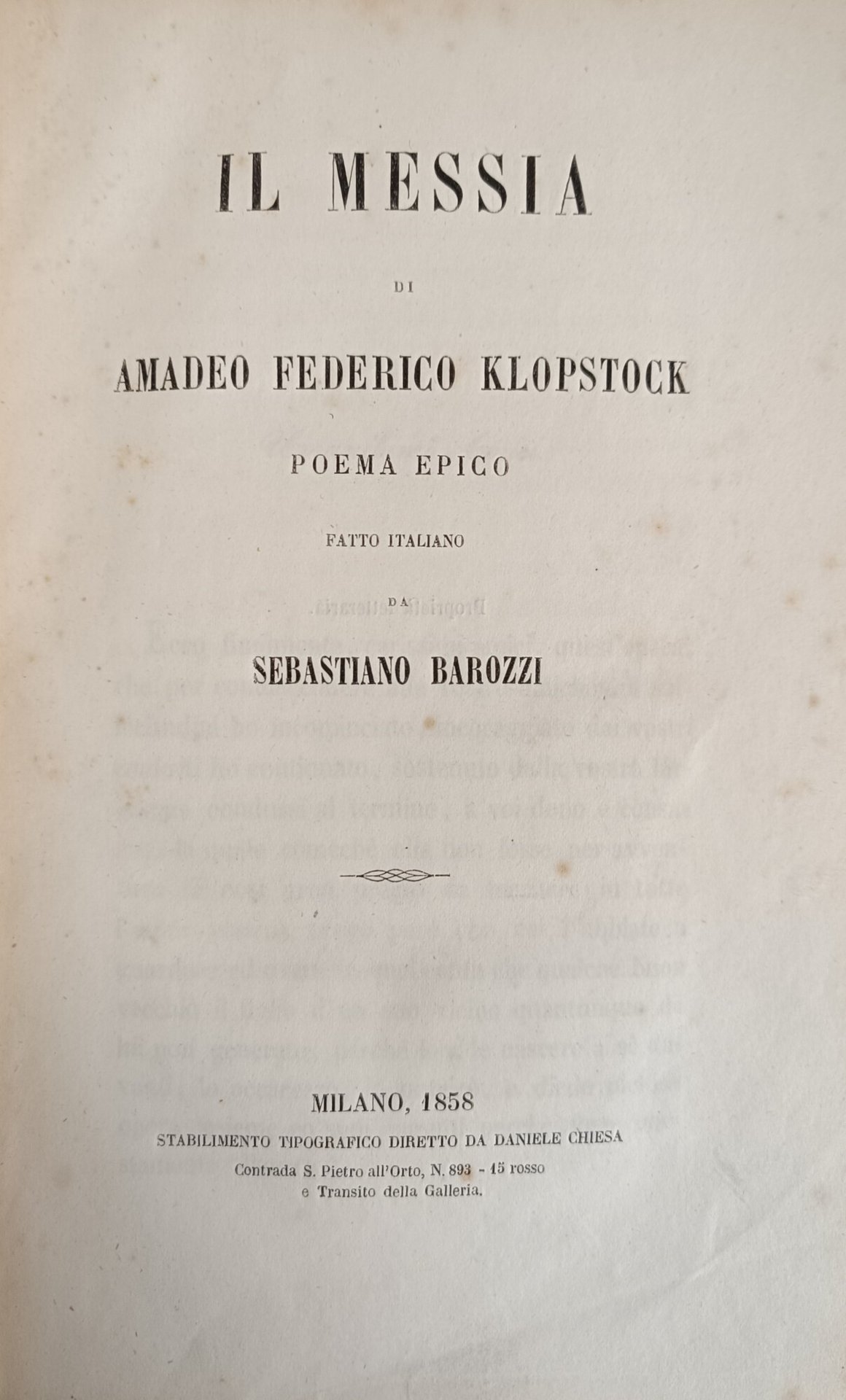 Poema epico fatto in italiano da Sebastiano Barozzi. in ottavo leg. mezza pelle con piatti marmorizzati, titolo e decorazioni in oro al dorso, tagli spruzzati pp. (8), 330, (2) Buono (Good) Buon es..