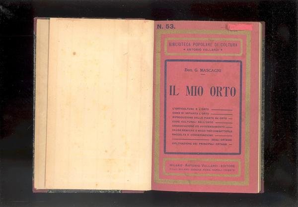 IN 16°, pp.144, RILEGATURA D'EPOCA IN MEZZA TELA CON TITOLO IN ORO AL DORSO, PIATTI MARMORIZZATI, MANTENUTA ALL'INTERNO LA COPERTINA EDITORIALE. 29 ILLUSTRAZIONI in b/n. NEL TESTO + UNA TAV. DOPPIA a col.f.t. CON 12 TIPI DI ORTAGGI. OPERA FACENTE PARTE DELLA BIBLIOTECA POPOLARE DI COLTURA, n°53. OTTIMA CONSERVAZIONE.ID 3343