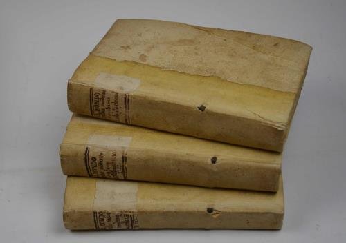 Tre volumi di cm. 19, pp. xxiii (1) 430 (2); (2) 435-856 (paginazione continua); (2) 859-1391 (1). Legatura coeva in cart. alla rustica con titoli ms. su etichette ai dorsi. Esemplare genuino e marginoso, ben conservato.