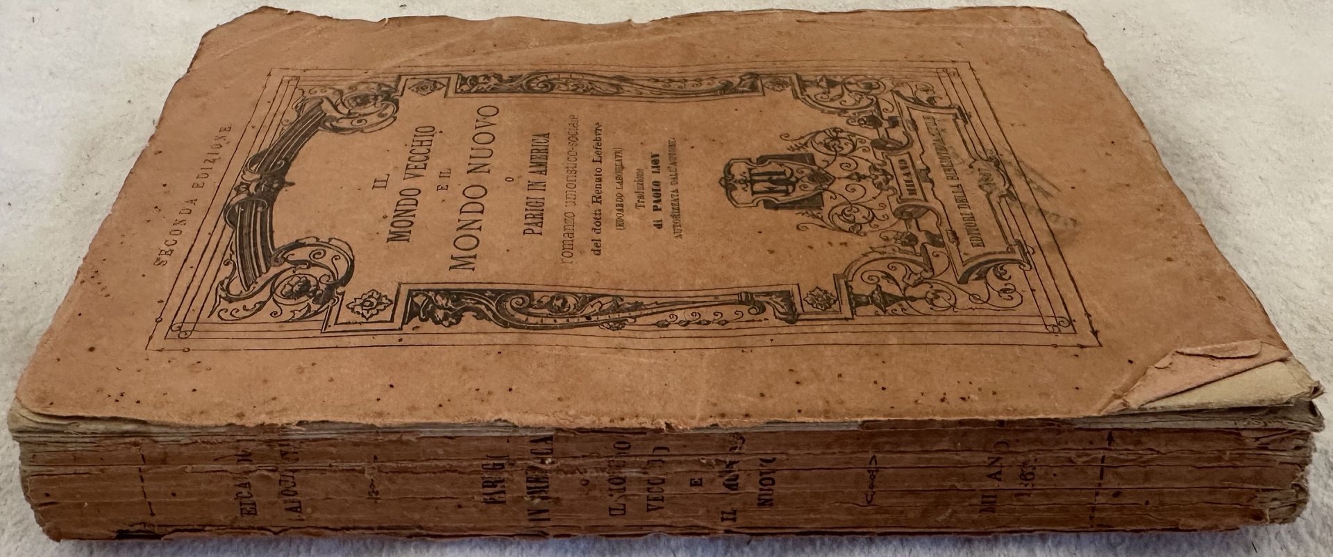 Edizione italiana del 1867 di questo romanzo di Edouard Rene Lefebvre de Laboulaye (1811-1883). Traduzione di Paolo Lioy. Prefazione di E. Castelnuovo. In discrete condizioni. Copertina editoriale in mediocri condizioni con usure ai margini e dorso. Piatto anteriore staccato e posteriore quasi staccato. Legatura in discrete condizioni con rotture. All'interno le pagine si presentano in buone condizioni con rare fioriture. In 8. cm 19,5x12,5. Pp. 379+(1).Italian edition of 1867 of this novel by Edouard Rene Lefebvre de Laboulaye (1811-1883). Translation by Paolo Lioy. Prefation by E. Castelnuovo. In fair conditions. Editorial cover in poor conditions with wearings in the extremities. Front plate is detached and back plate is almost detached. Binding in fair conditions with cracks. Inside pages are in good conditions with occasional foxing. In 8. cm 19,5x12,5. Pp. 379+(1).