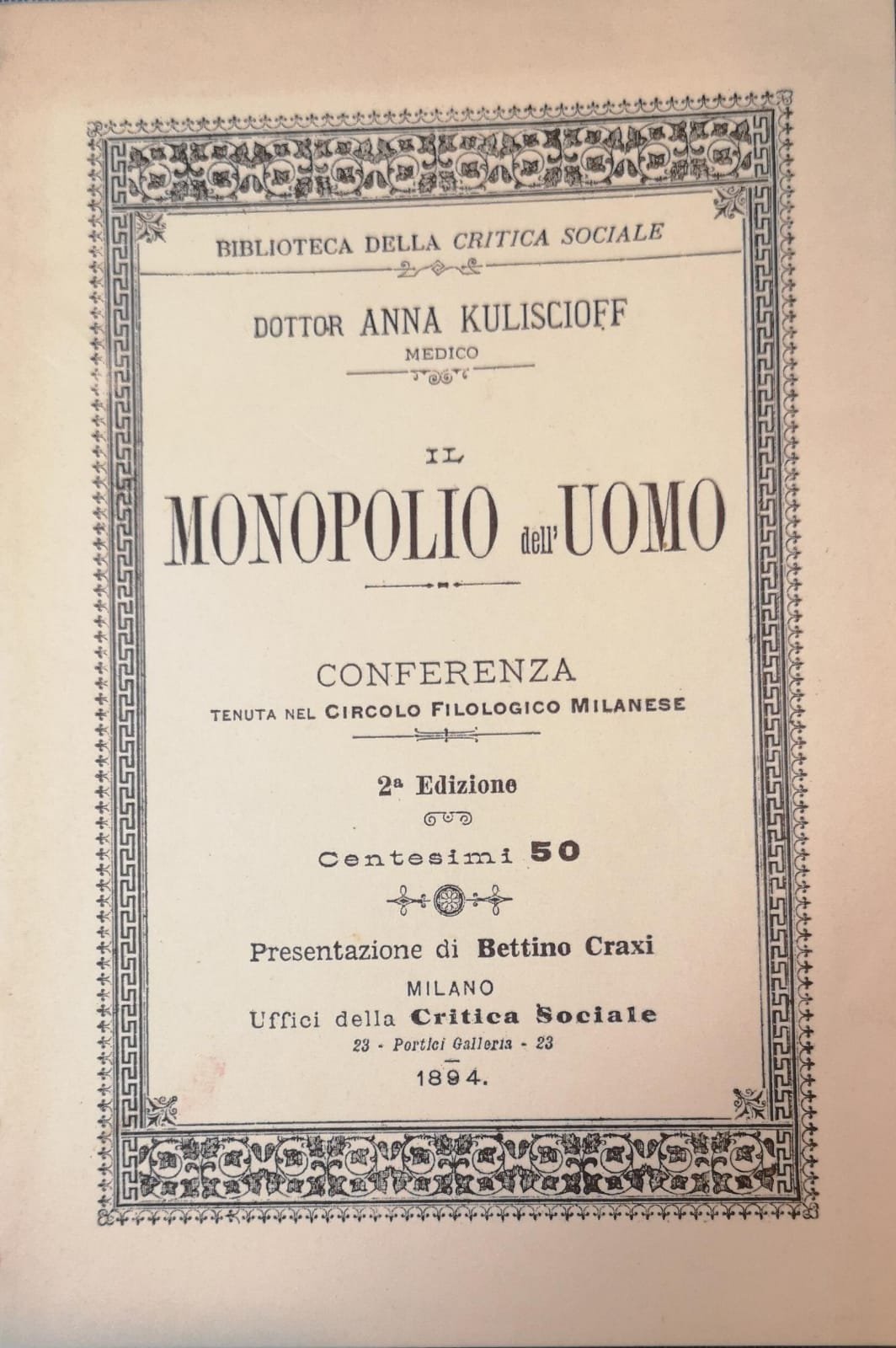 Il monopolio dell'uomo: conferenza tenuta nel Circolo filologico milanese (Reprint)