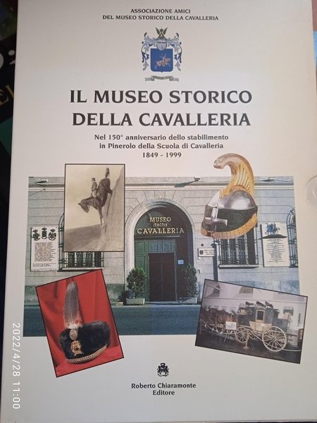 PRIMA EDIZIONE edita a cura degli Amici del museo storico della cavalleria nel 150° anniversario (1849-1999) dello stabilimento in Pinerolo della scuola di cavalleria. Con introduzione di Roberto Nasi. Catalogo guida del percorso museale: Il costume militare della cavalleria; Il cavallo e le performances equestri; Copricapi della cavalleria italiana; Allievi stranieri alla scuola di Pinerolo; Decorazioni e onorificenze; Bronzi, quadri e stampe delle raccolte. Cartonato con cofanetto. Pp. 121. Ottime condizioni