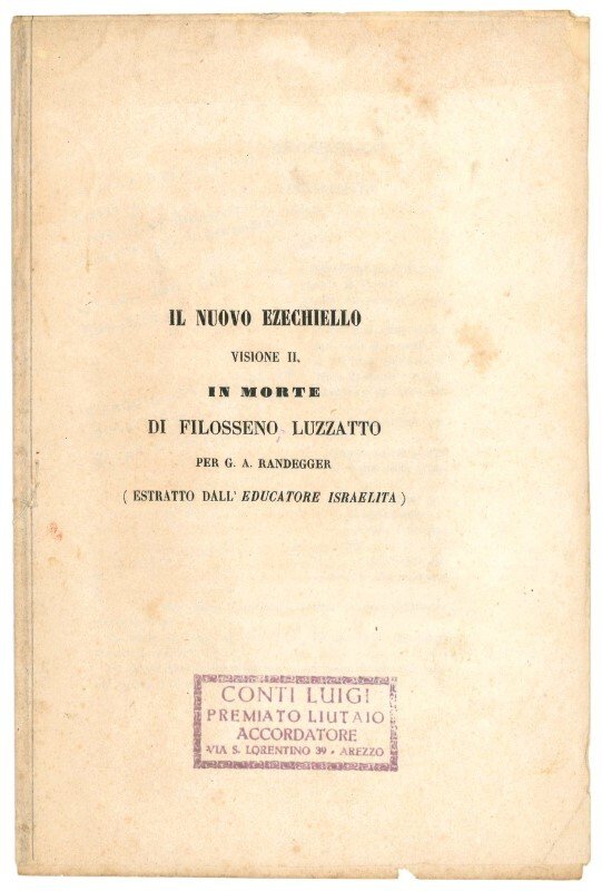 Mm. 244x156. Pp. [6]. Estratto da ‘L'educatore israelita: giornale mensile per la storia e lo spirito del giudaismo', A. 2 (1854), pp. 68-73. C. lievemente brunita. Opuscolo con titolo alla cop. ant. Presente timbro 'Conti Luigi [...]' alla cop. ant. Prima ed unica edizione.