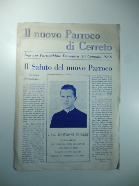 Formato giornale cm. 25 x 35, pp. 4 non numerate, con 4 illustrazioni fotografiche in bianco e nero raffiguranti don Giovanni Burzio, il Pontefice Paolo VI, il Vecovo Giacomo Cannonero. Numero speciale realizzato per l'insediamento del nuovo parroco di Cerreto don Giovanni Burzio con i suoi saluti, il telegramma del Papa, la benedizione del Vescovo, il saluto del Sindaco e le note biografiche del nuovo parroco. Alone brunito al margine superiore della prima pagina.