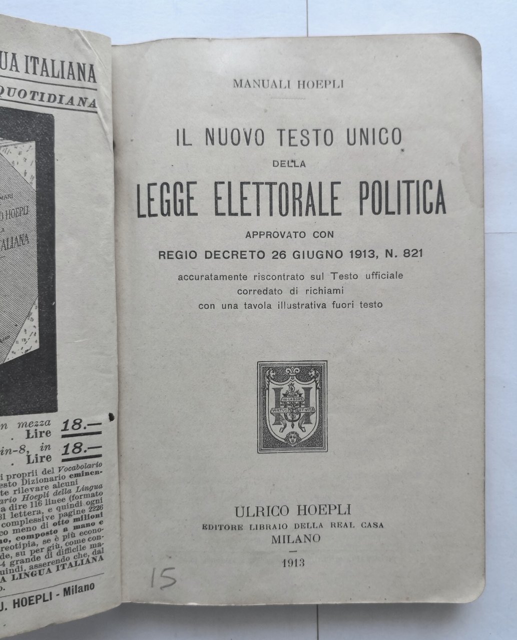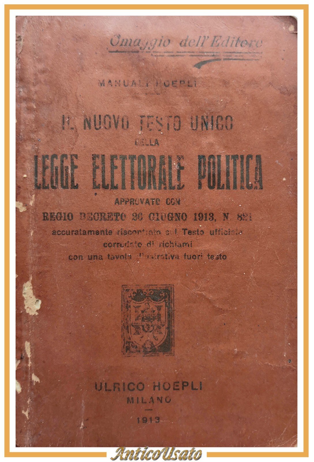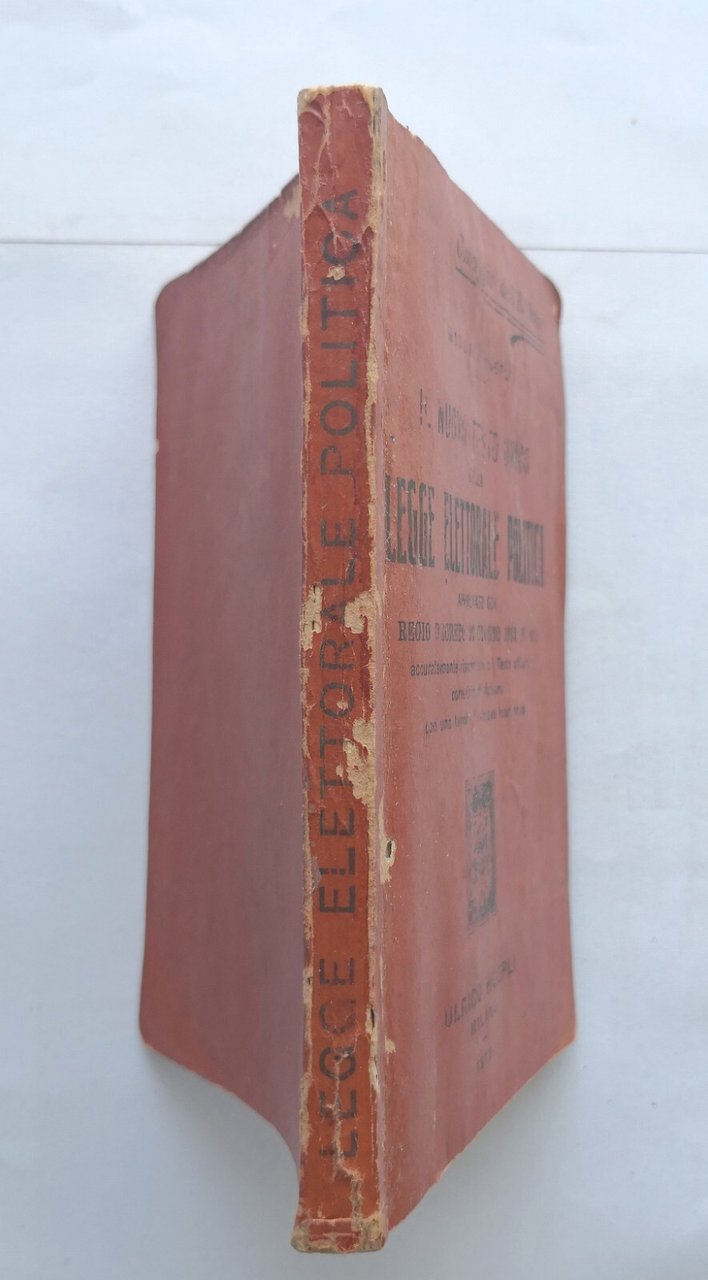 IL NUOVO TESTO UNICO DELLA LEGGE ELETTORALE POLITICA approvata con regio decreto 26 giugno 1913. Editore Hoepli, manuali, 1913. 62 pagine + (32 + 128 pagine di catalogo manuali Hoepli), 1 tavola più volte ripiegate fuori testo. Copertina editoriale in brossura. Stato di conservazione: buono (pagine normalmente ingiallite, leggera gora d'umido con conseguente imbarcamento alle prime 10 pagine e al piatto anteriore, piccole spellature ai piatti) Libro usato saggistica politica diritto legge