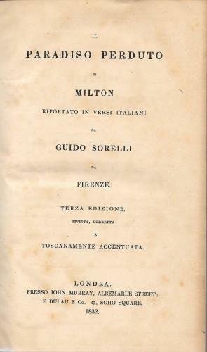 Il paradiso perduto di Milton riportato in versi italiani da Guido Sorelli da Firenze. Terza edizione, rivista, corretta e toscanamente accentuata