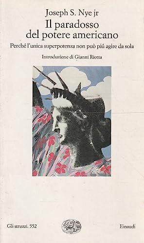 Nye, Joseph S. jr. Il paradosso del potere americano. Perché l'unica superpotenza non può più agire da sola. , Einaudi 2002 italiano, 262 Edizione Einaudi - Gli Struzzi n. 552 - giugno 2002 - in COPERTINA FLESSIBILE ILLUSTRATA. Copertina con aloni causati dalla polvere in particolare lunghi i bordi del la lato anteriore, comunque integra e ben conservata. Pagine all'ìinterno leggermente imbrunite fattore tempo ma volume in buonissime condizioni. Disponibilità immediata e spedizione con corriere tracciata.