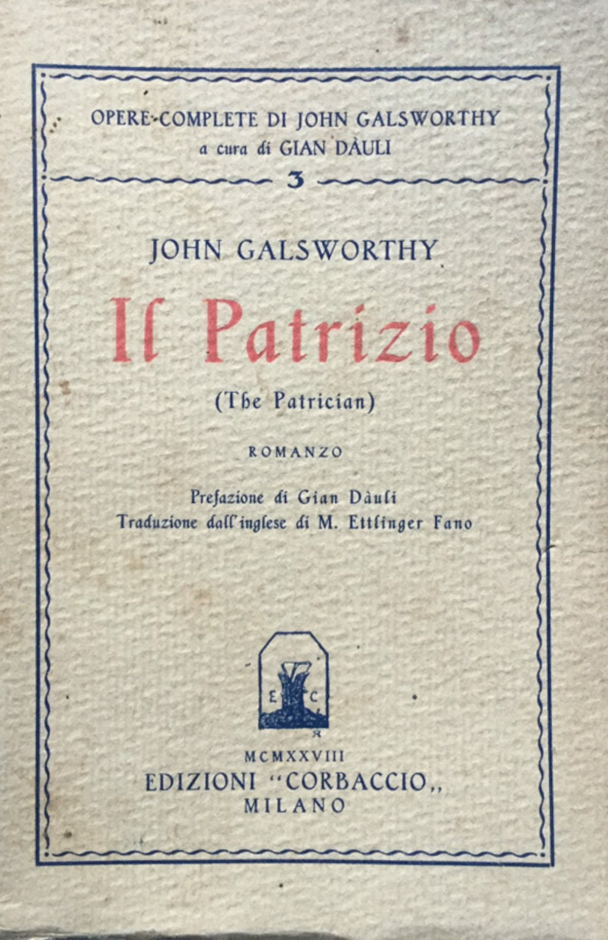 Milano, Corbaccio 1928, in 8vo. Brossura editoriale, 341 pp. Coll. Opere complete di John Galsworthy, 3. A cura di Gian Dauli. (The Patrician, traduzione di M. Ettlinger Fano. Prefazione di Gian Dauli). 823 - V In Ottavi (15-23cm ) Buono (Good) Buono