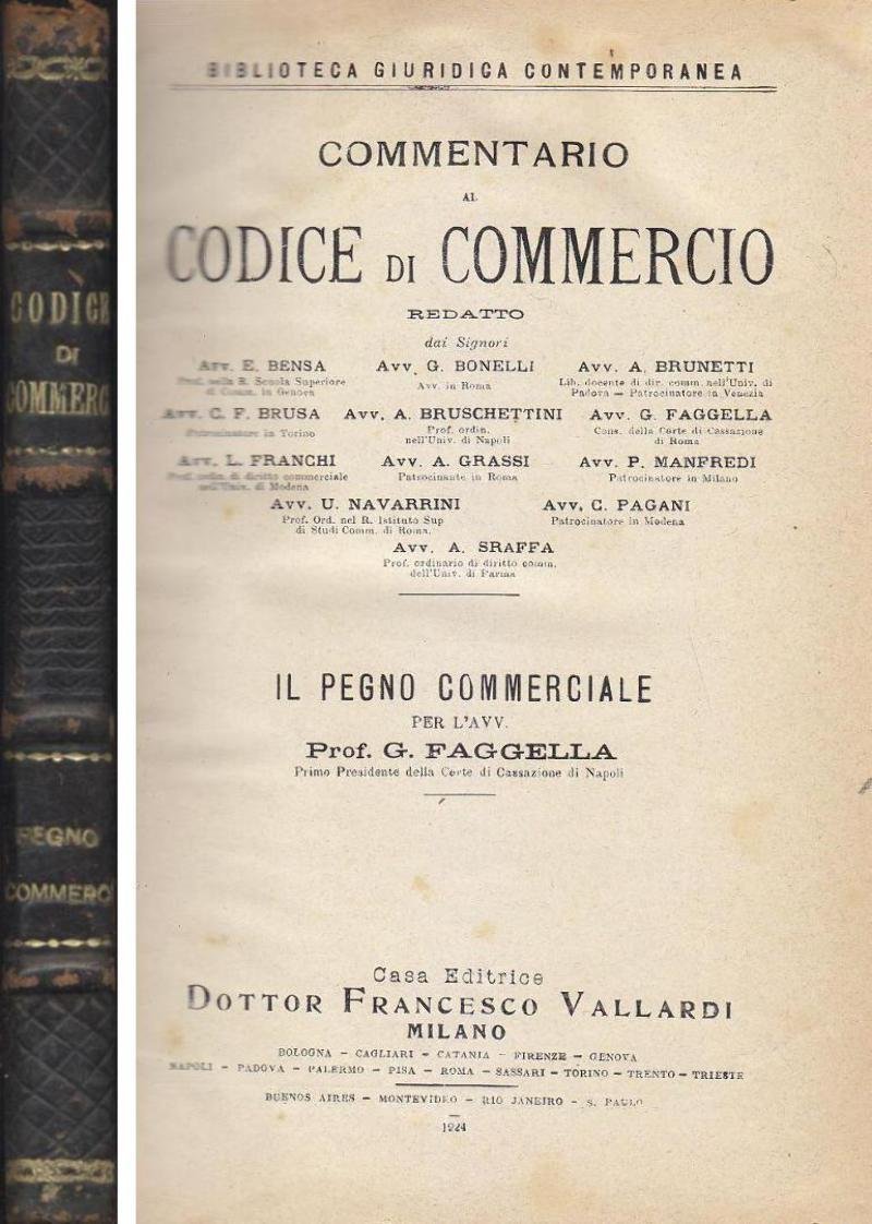 IL PEGNO COMMERCIALE di Faggella commentario al codice di commercio 1924 libro