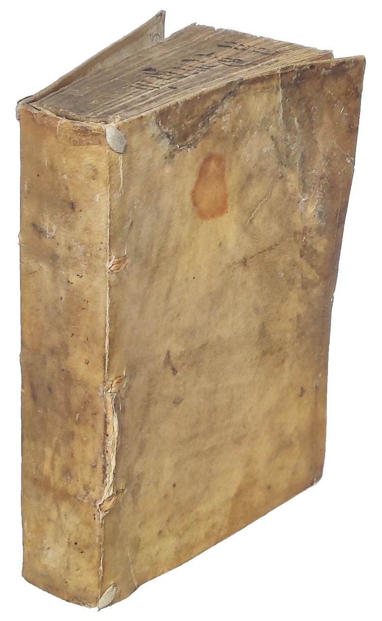 In 8vo (mm. 155x98). Cc. [8], 271, [1 bianca]. Segnatura: *8 A-LL8. Titolo in cornice xilografica e 4 illustrazioni incise in legno nel testo, una a tre quarti di pagina alla c. A1r e tre vignette più piccole all'inizio di ciascuno dei tre libri di cui si compone l'opera. In fine, a c. KK5v, si trova la Vita de Giacopo Cauiceo, per Georgio Anselmo. Carattere romano e corsivo. Pergamena semirigida posteriore con nervi passanti e titolo al taglio superiore (restauri e mancanze, leggermente macchiata). Titolo brunito e con una piccola mancanza al recto e al verso, piccole mancanze anche alla carta A1 con perdita di tre lettere, leggere fioriture sparse.